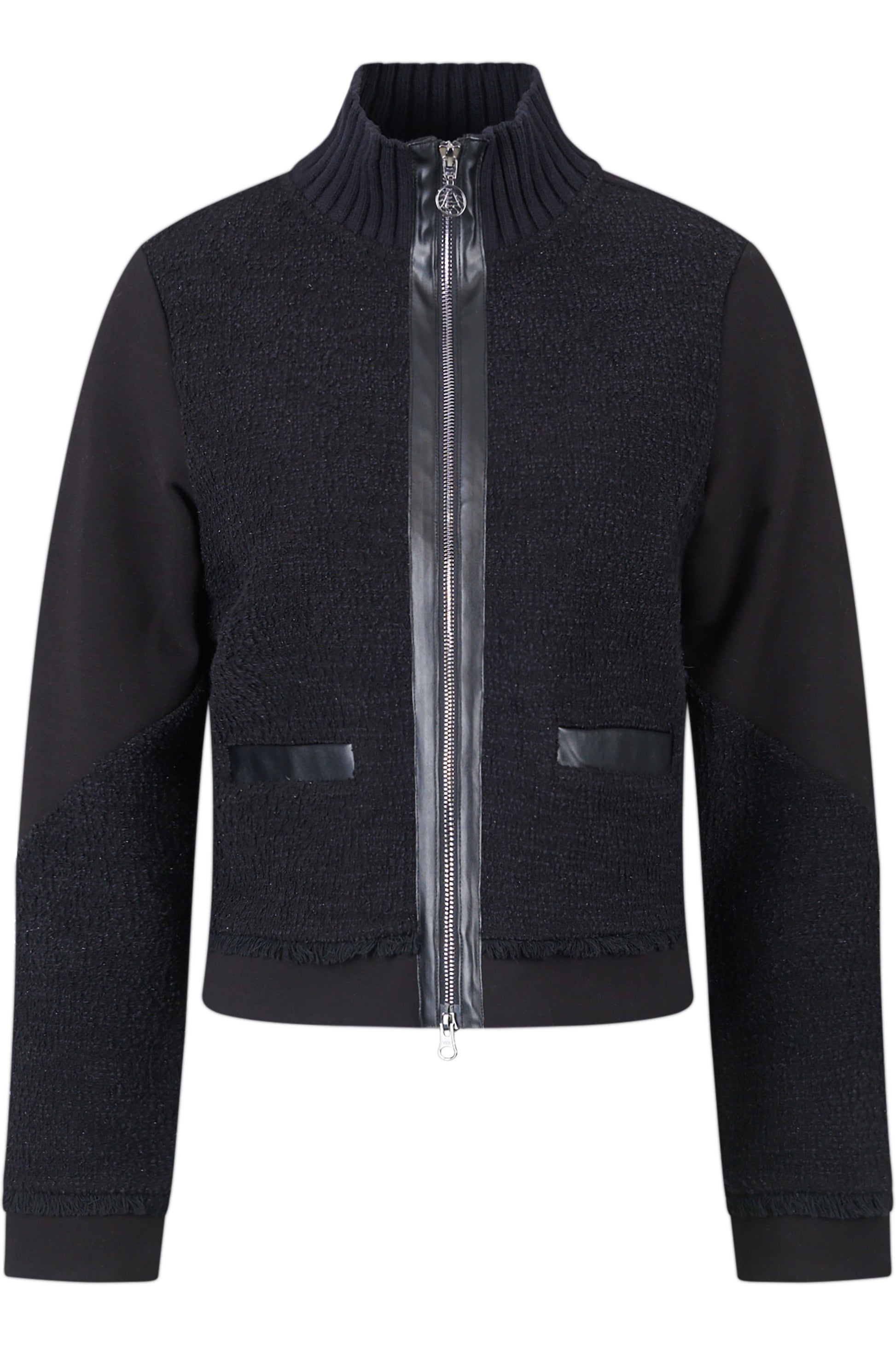 This sweat jacket made of fine bouclé fabric combines stylish faux leather details and sophisticated fringed elements. This perfect blend of elegance and modern accents makes it a versatile and fashionable highlight.