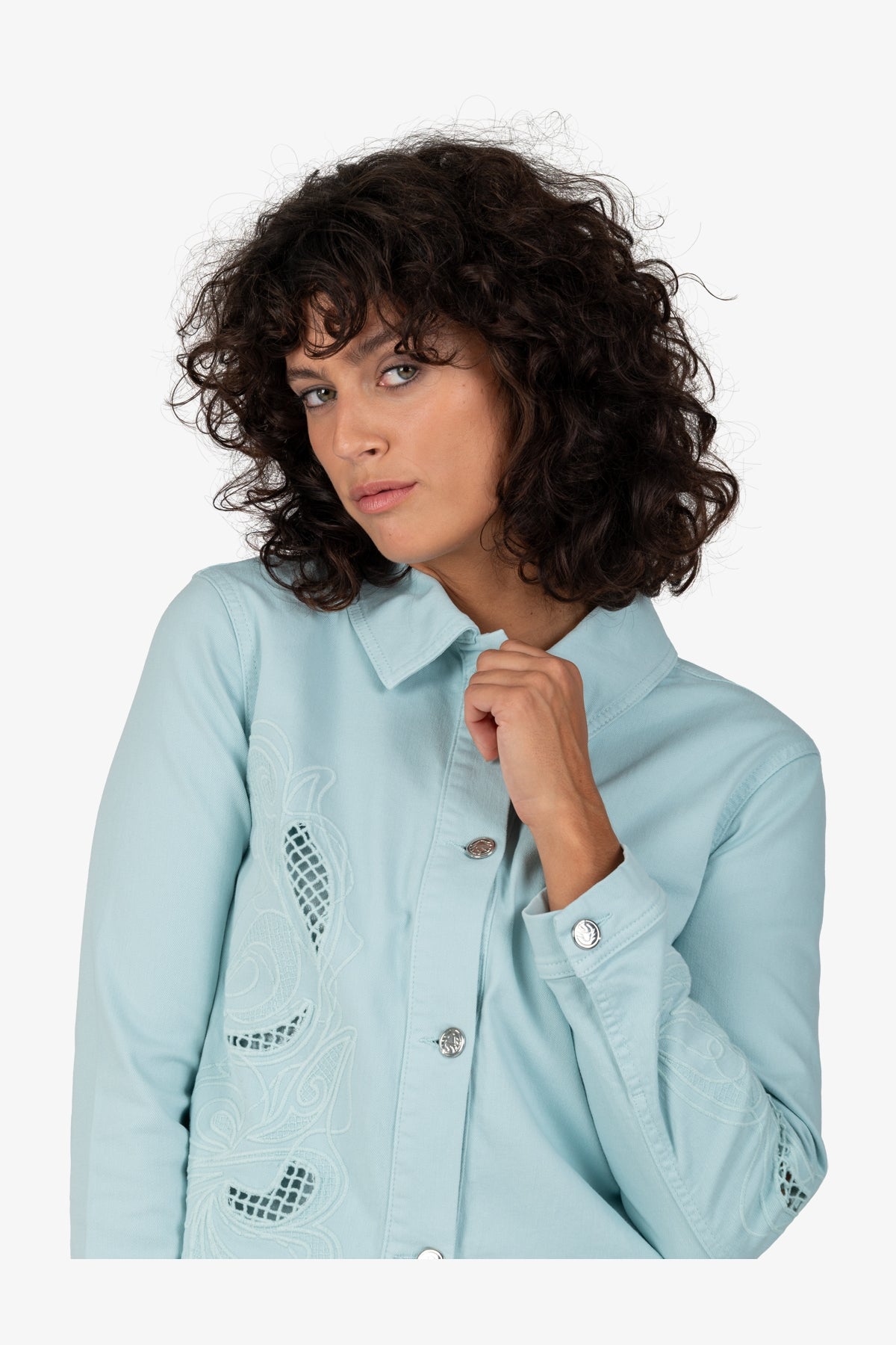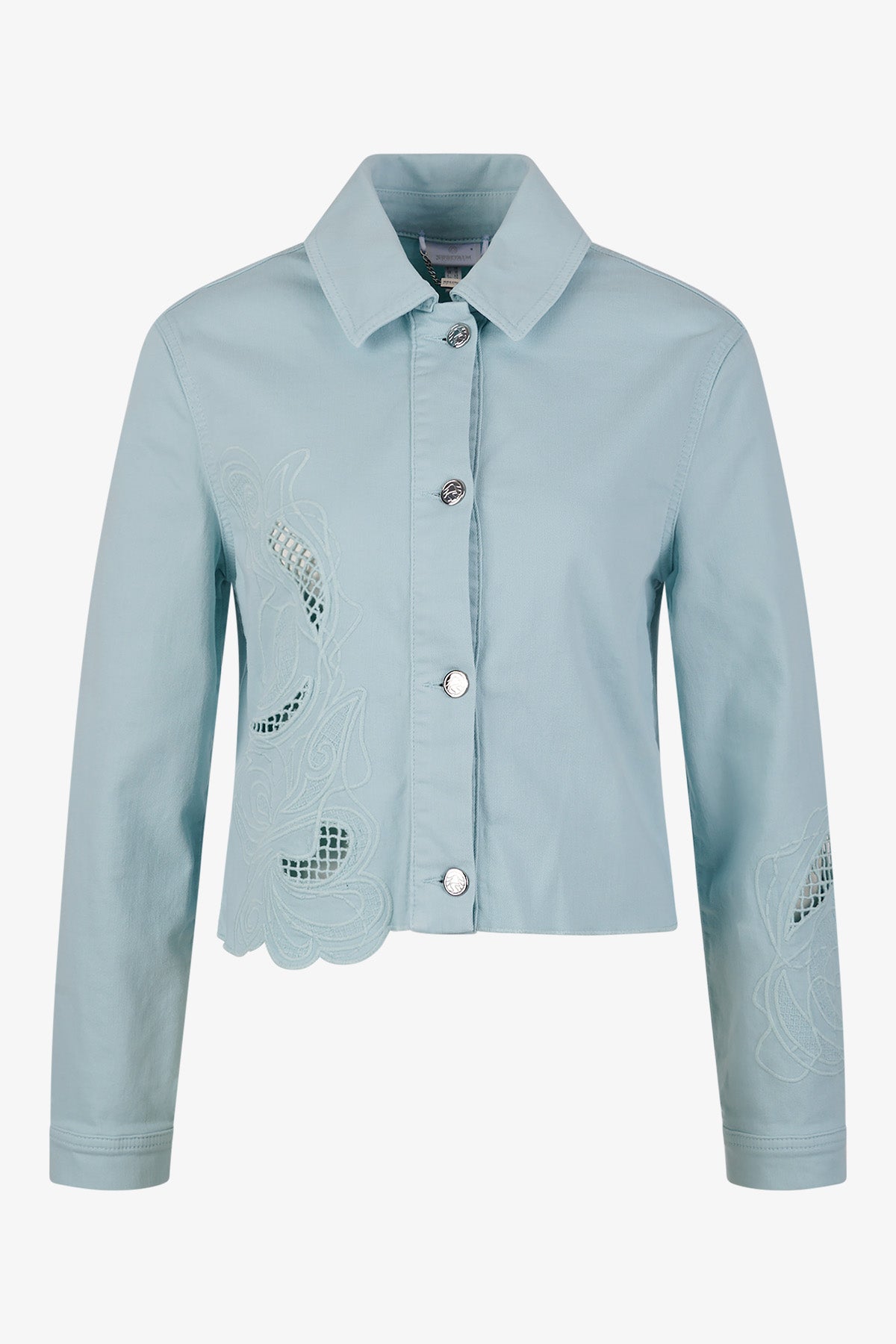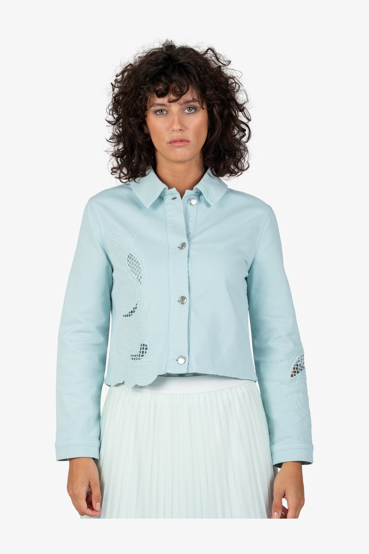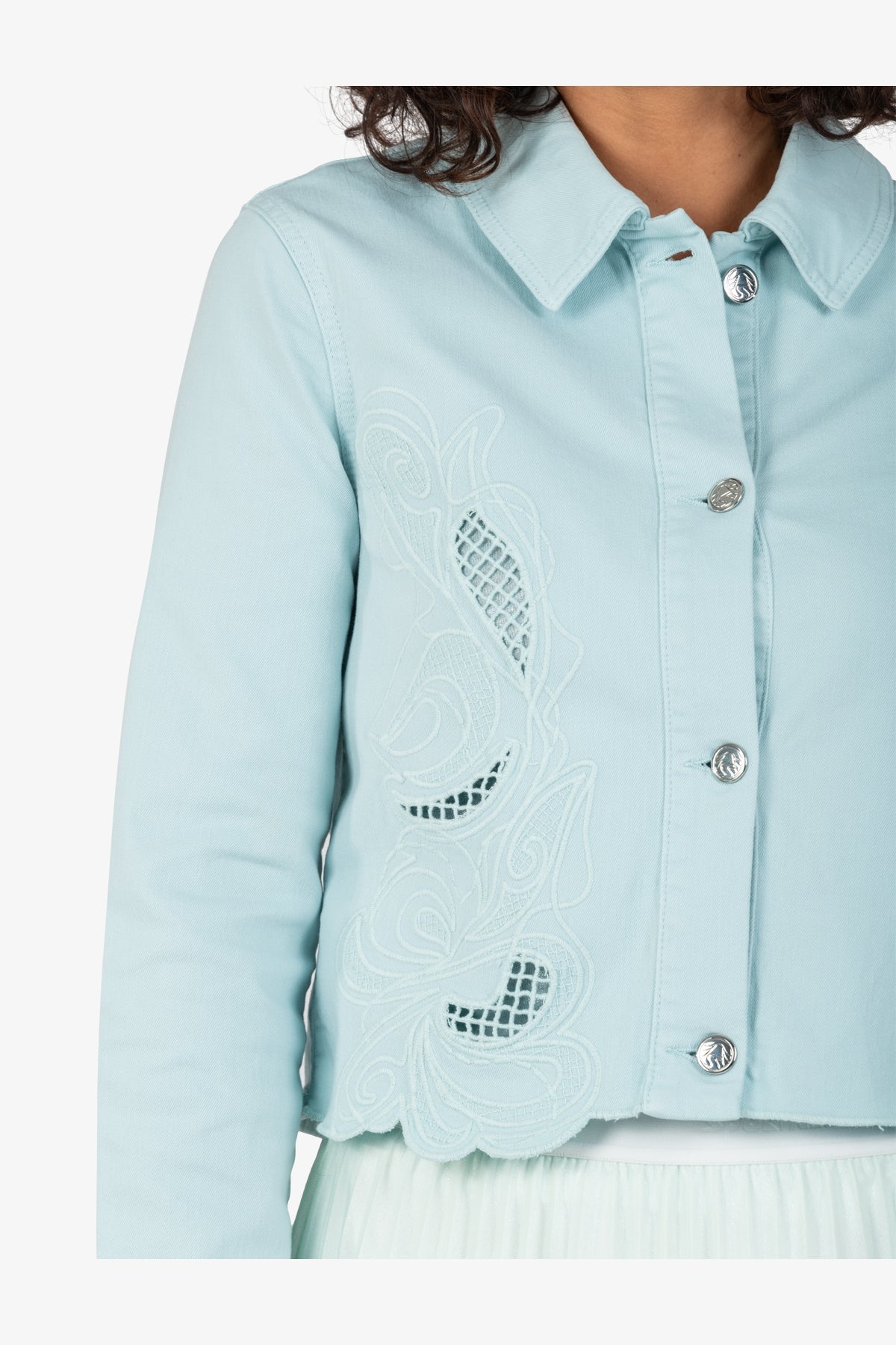This summery denim jacket with feminine embroidery impresses with its fashionable silhouette. Perfect for a trendy and elegant look on warm days.