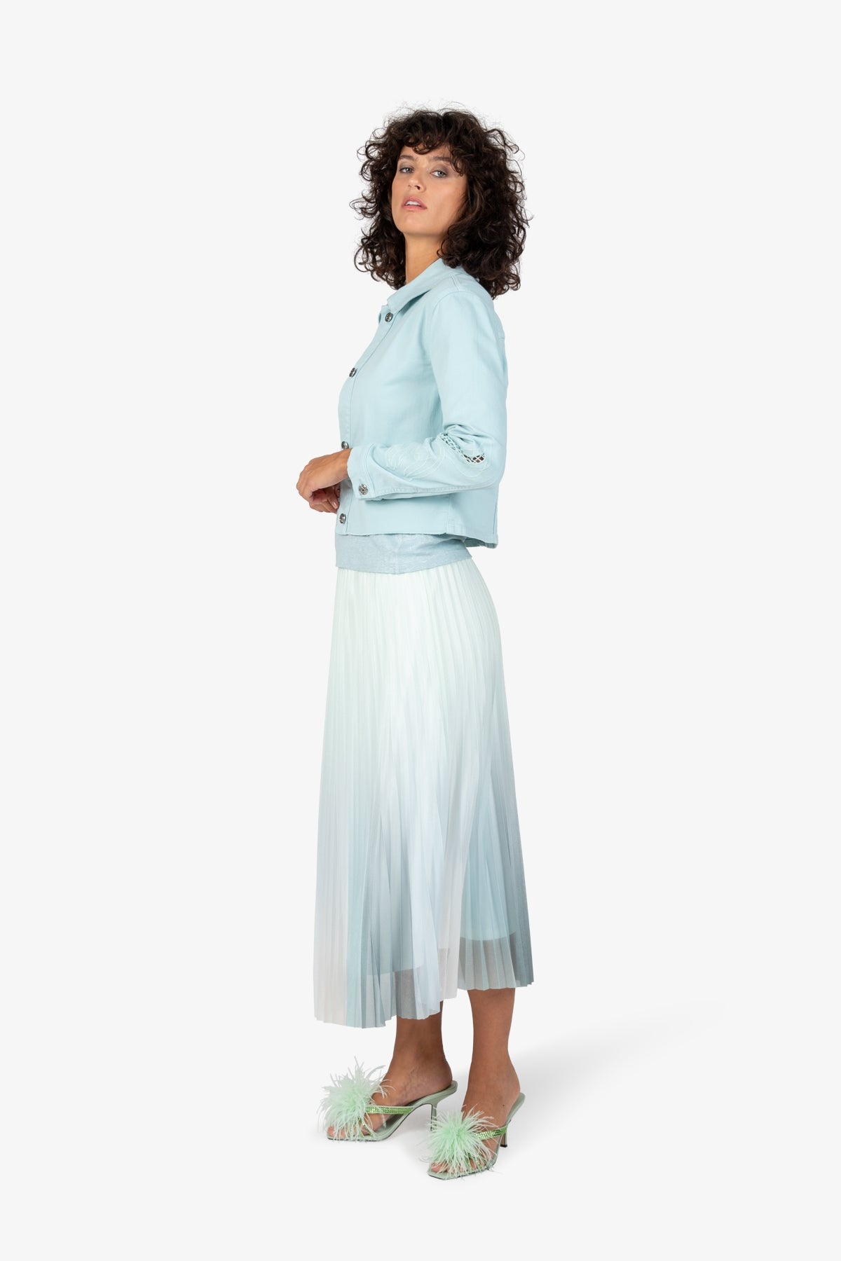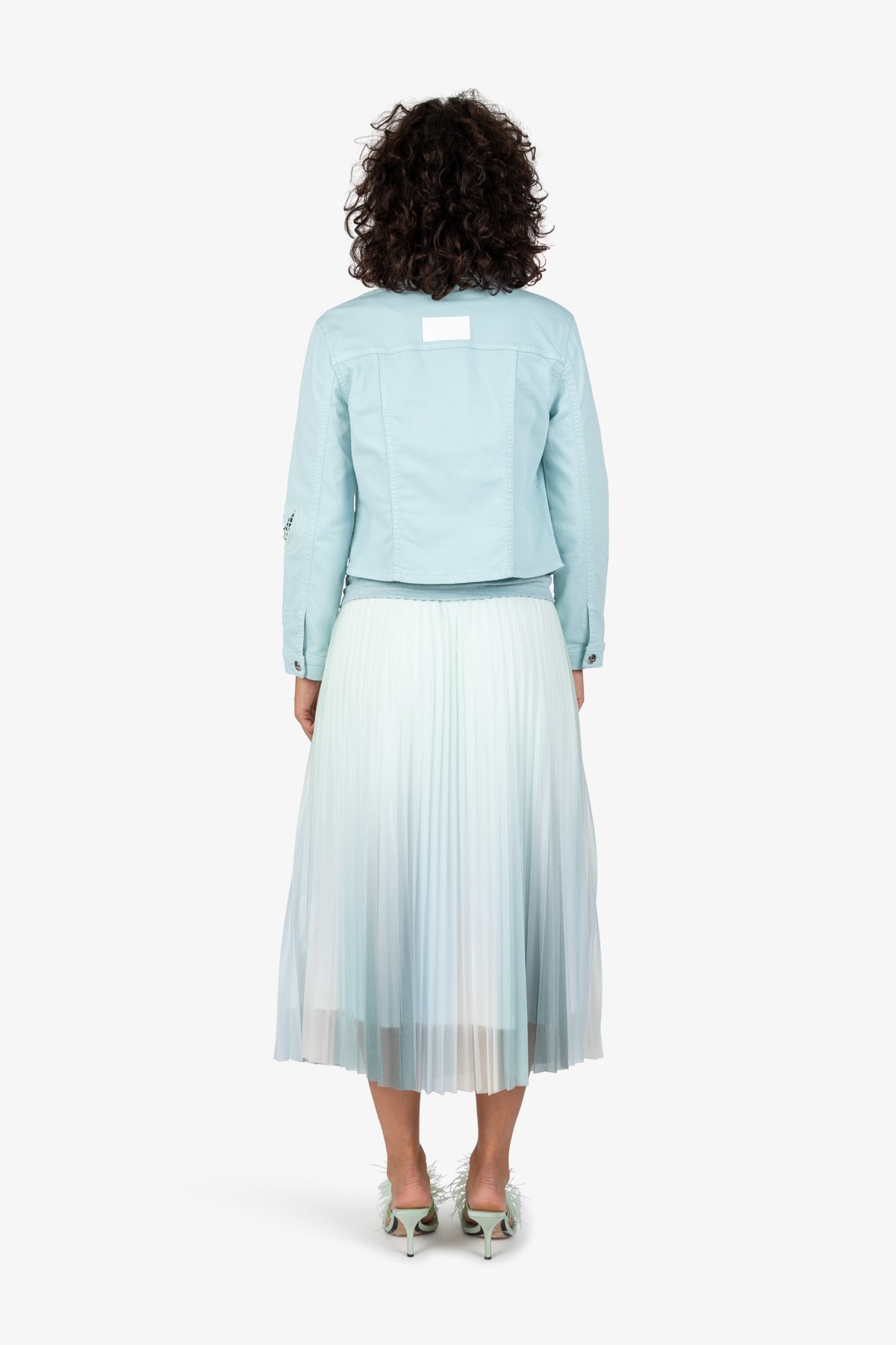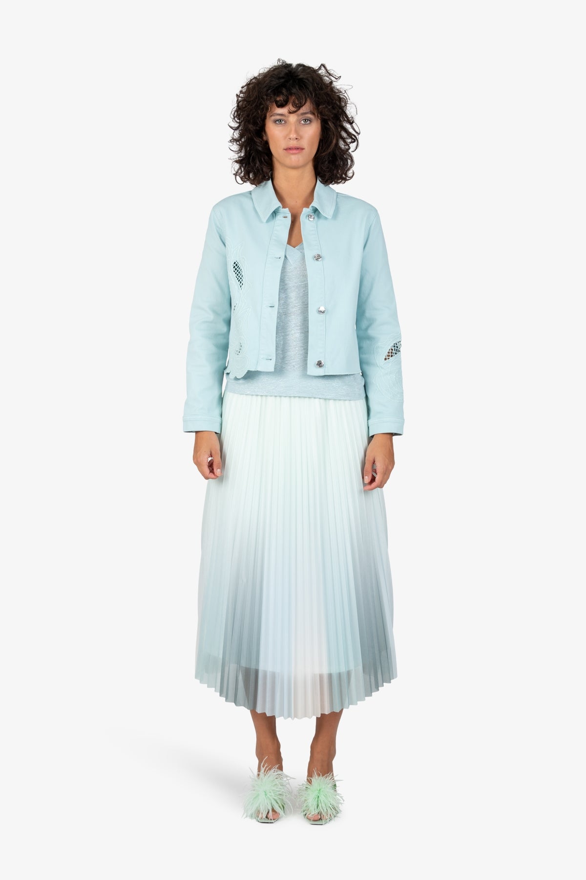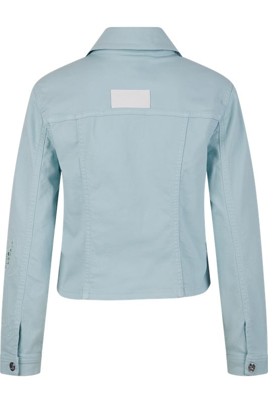 This summery denim jacket with feminine embroidery impresses with its fashionable silhouette. Perfect for a trendy and elegant look on warm days.