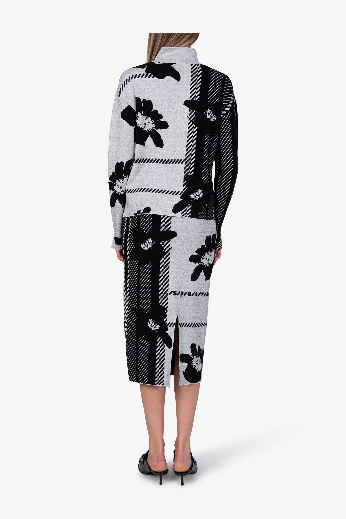 Pattern: abstract check jacquard with integrated floral motifs