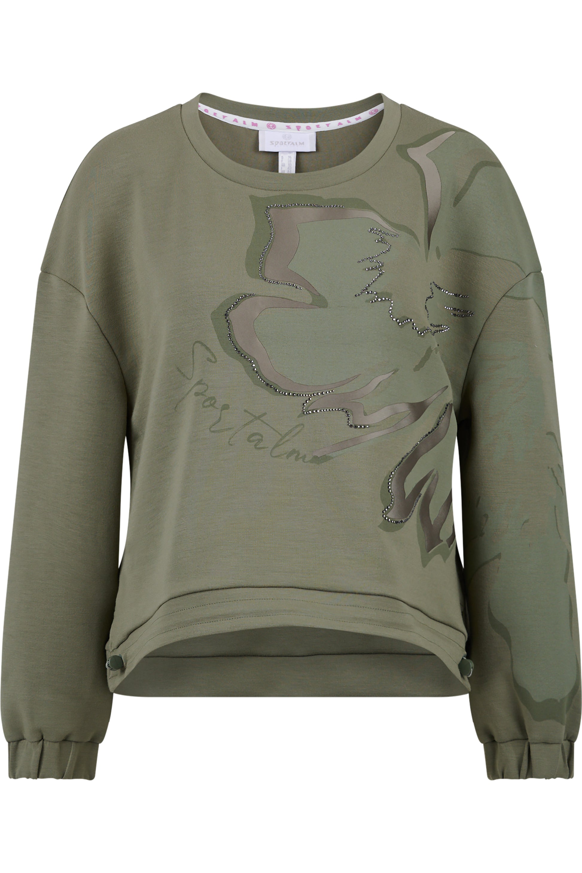 Highlights: floral print at the front decorated with rhinestones, drawstring hem at the front to adjust the width, small slits at the sides