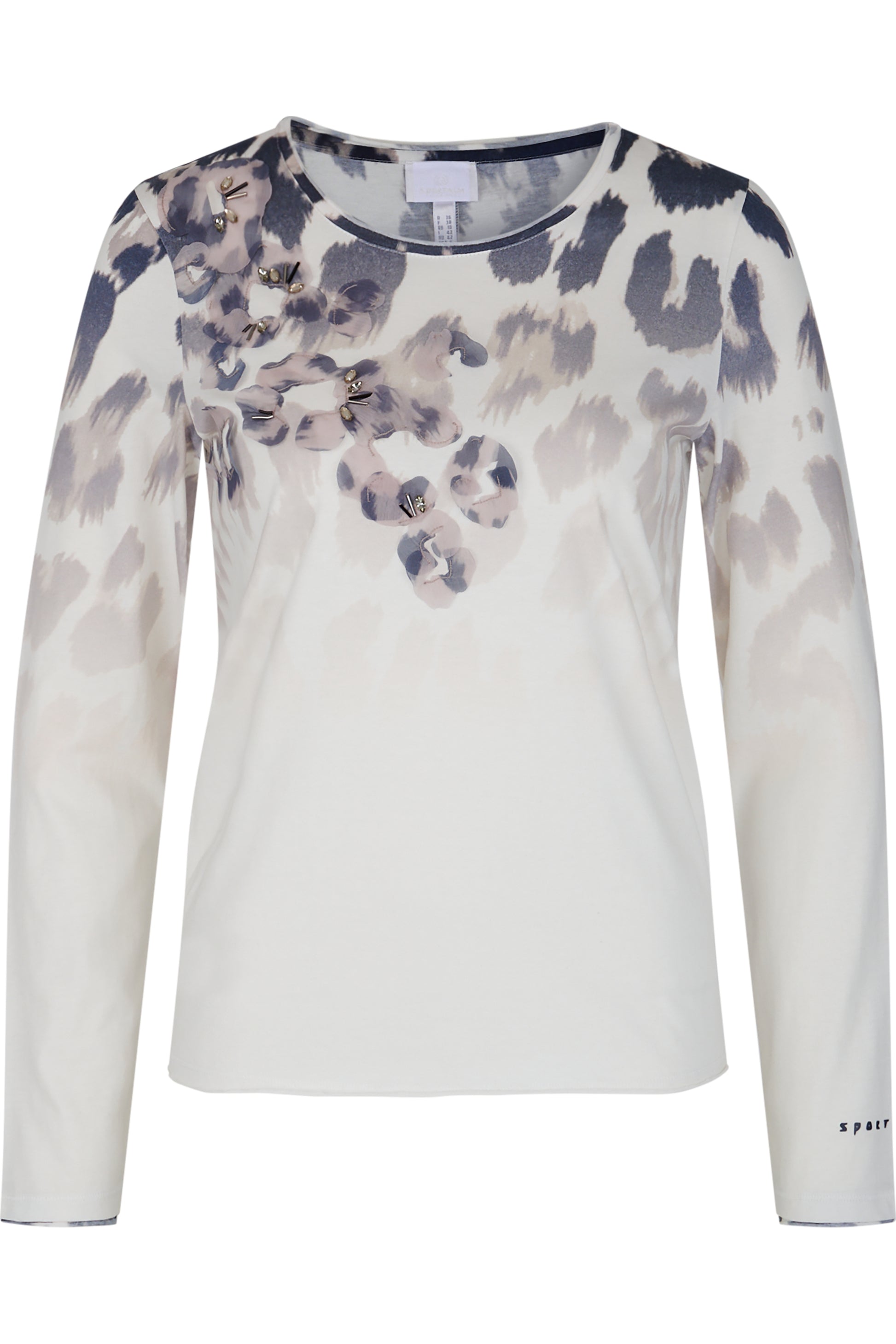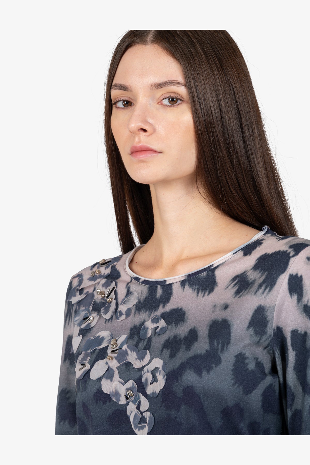 Highlights: appliquéd chiffon patches with leopard print and decorative stones, colour-contrasting flatlock seams, opened edge look