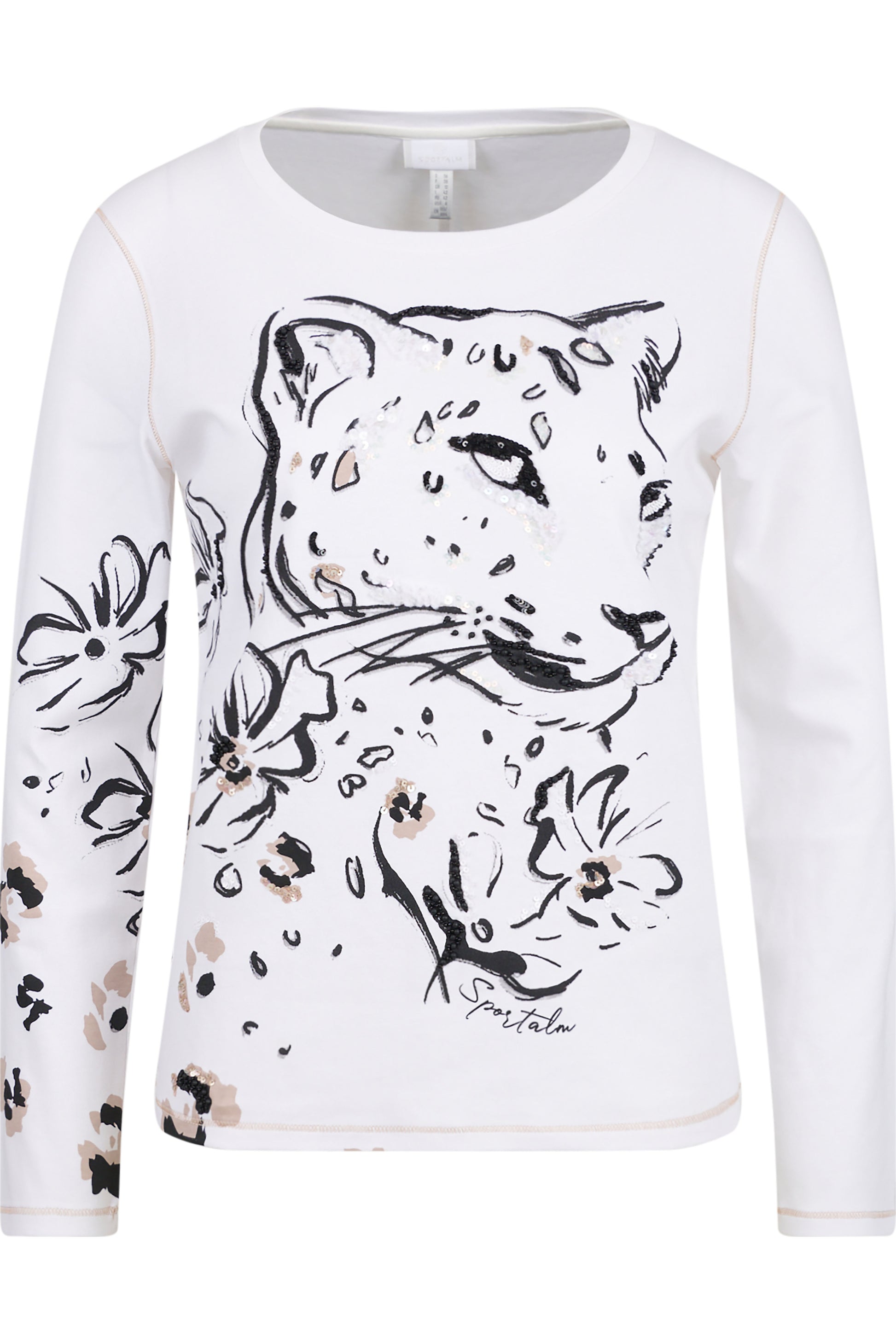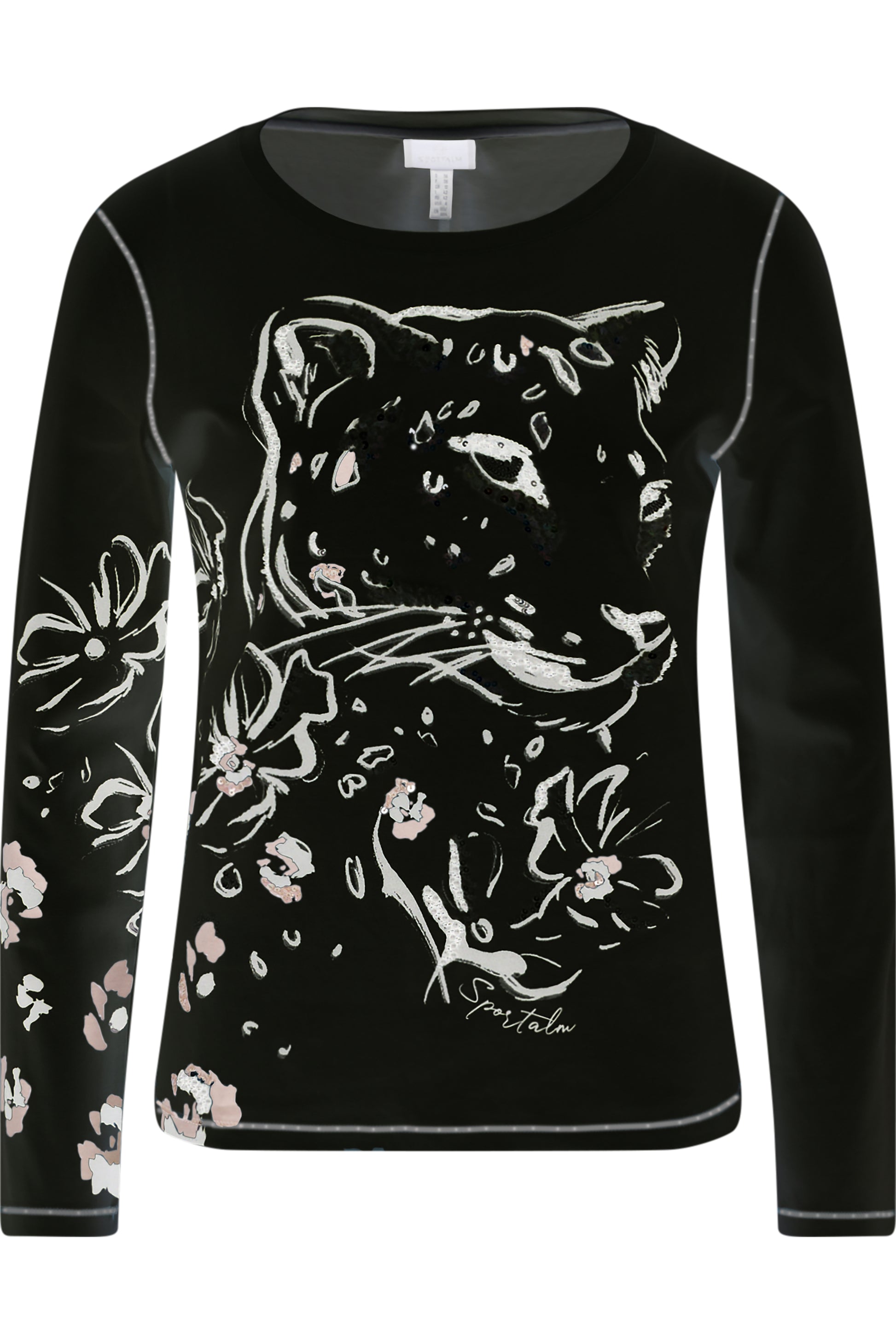 Highlights: elaborate leo print with embroidery and sequins on the front and right sleeve, decorative flatlock seams, small Sportalm lettering as a silicone transfer on the back
