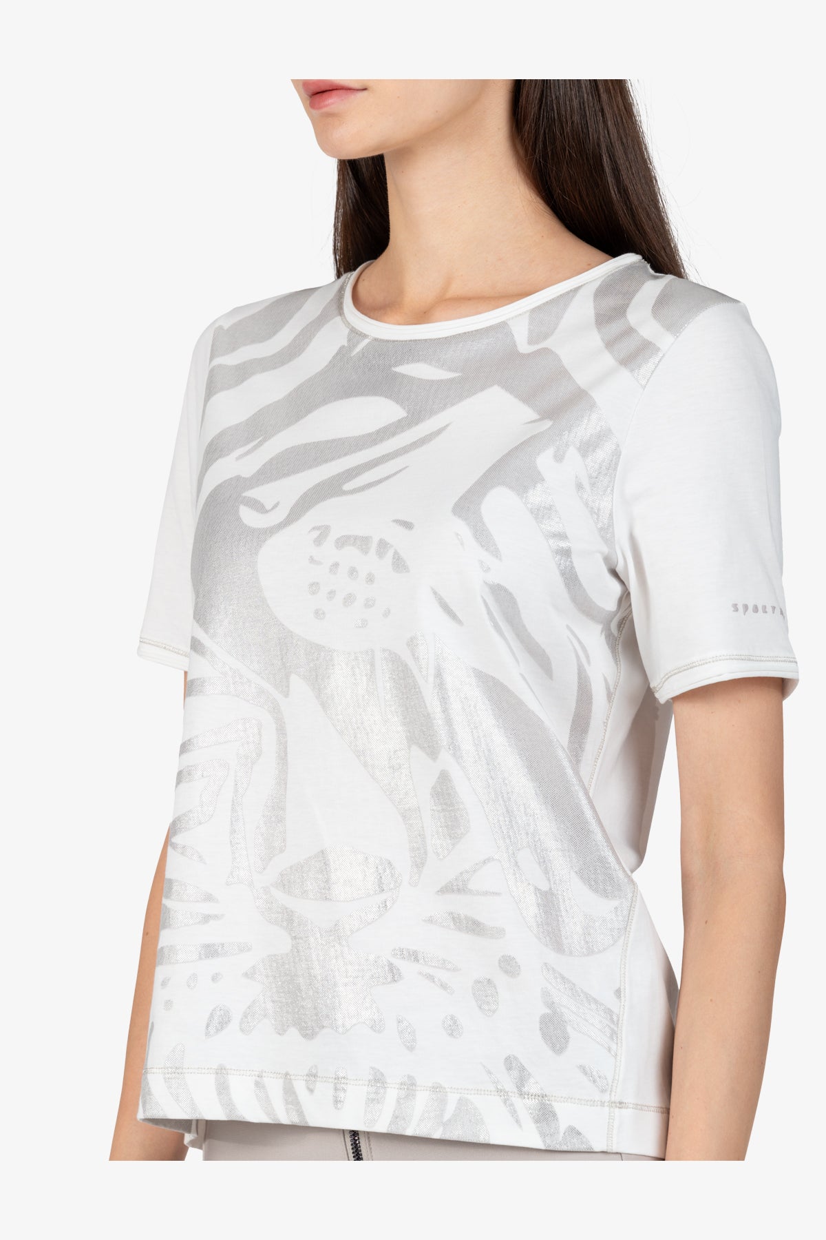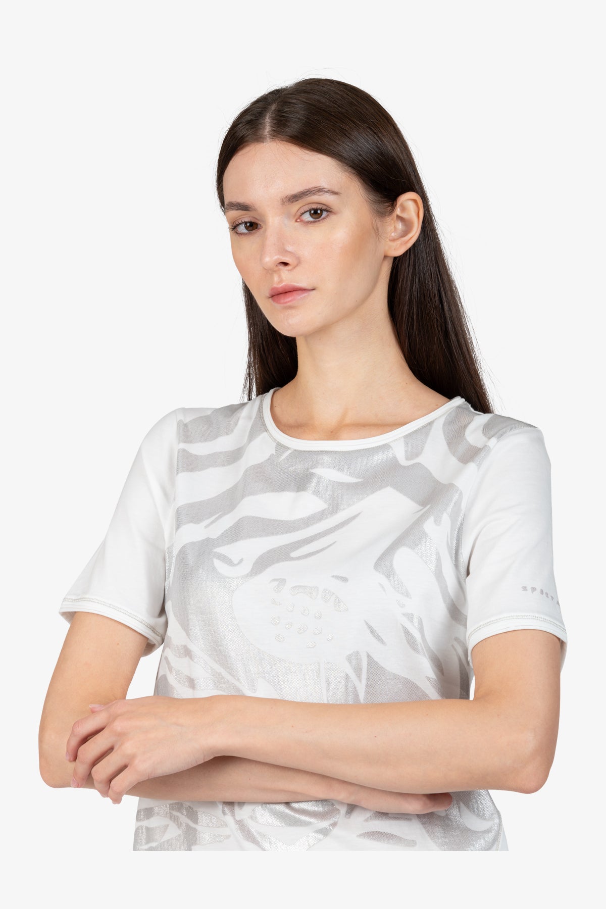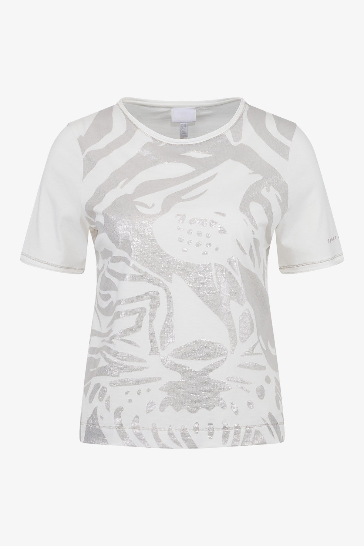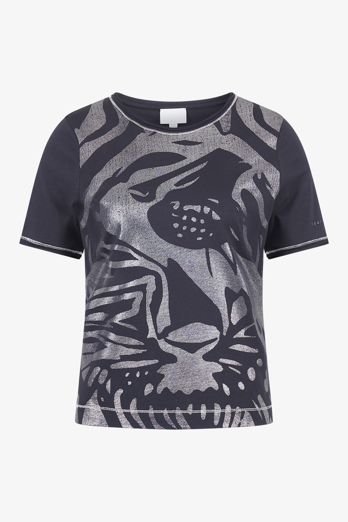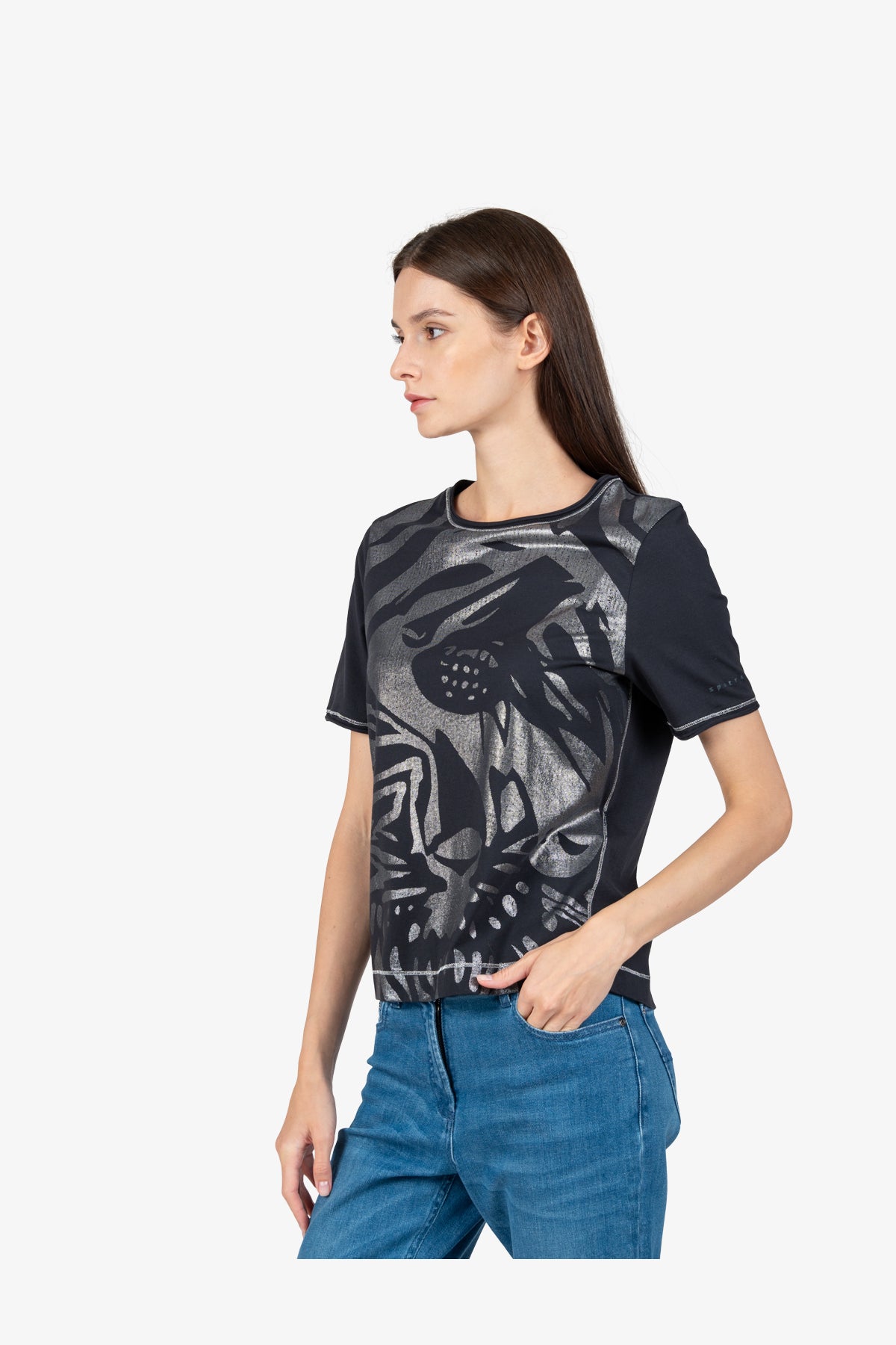 This short-sleeved shirt with large foil print flatters the figure and suits every woman. Its cut and design are versatile and timeless, perfect for a range of occasions.
