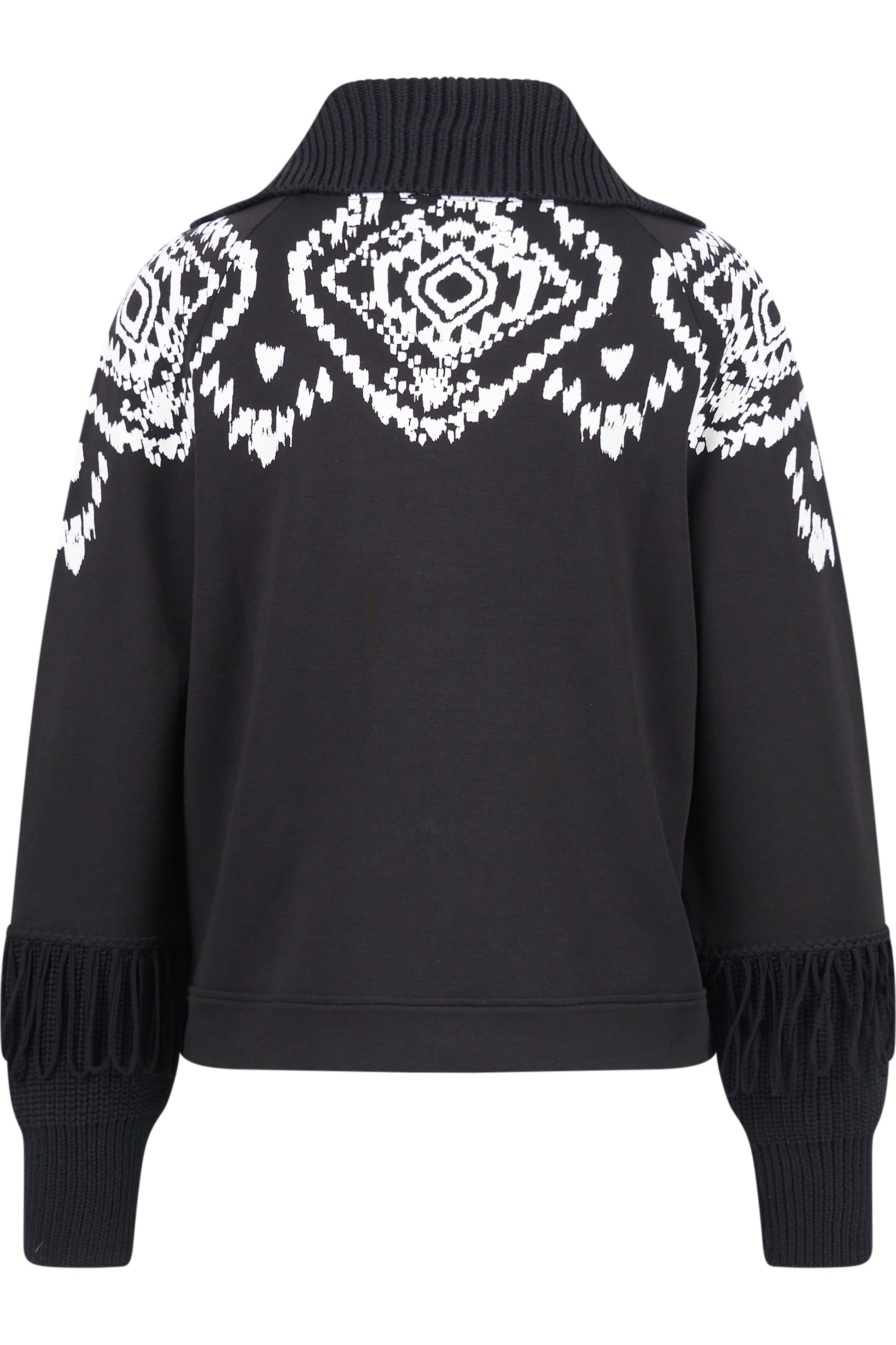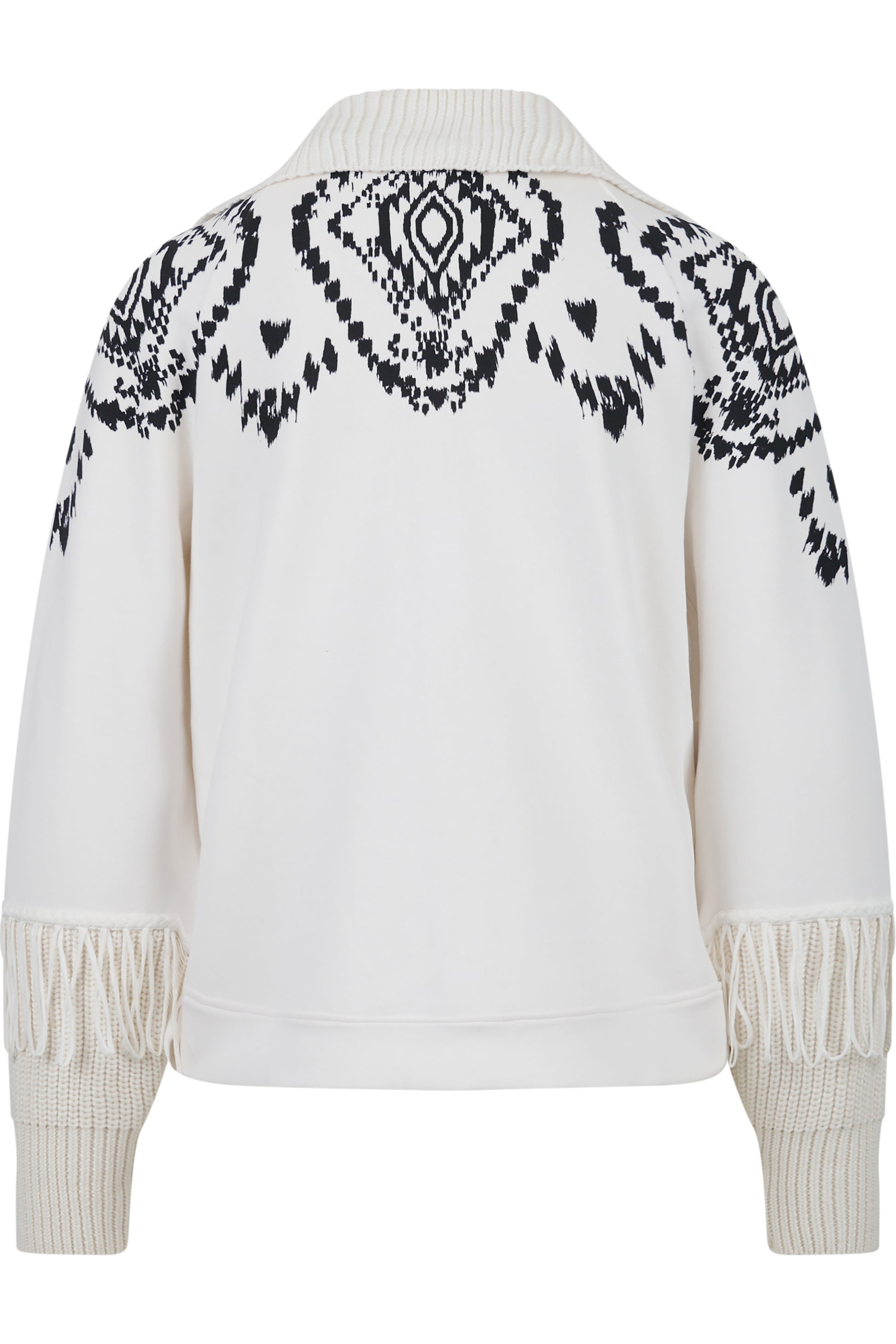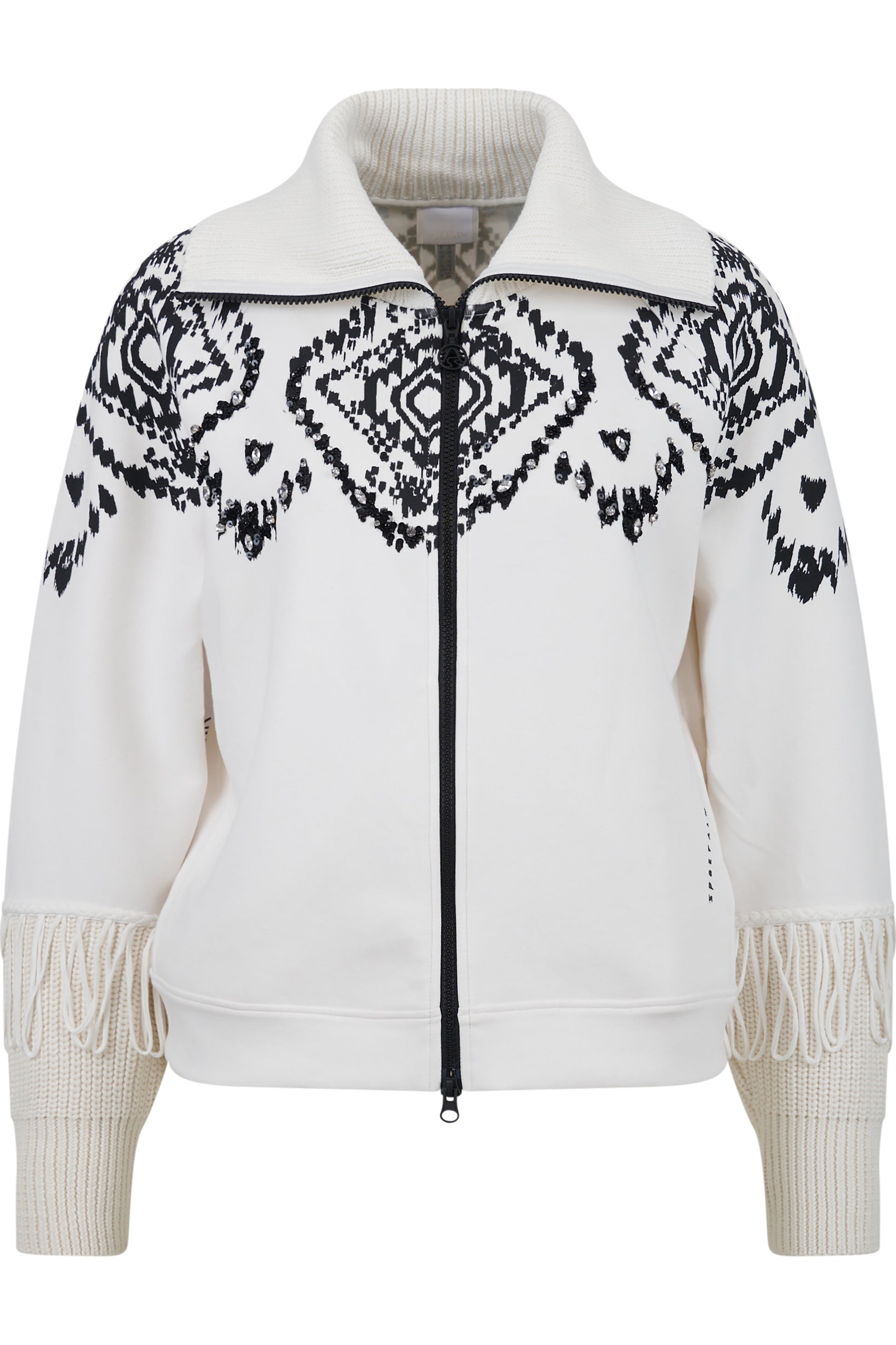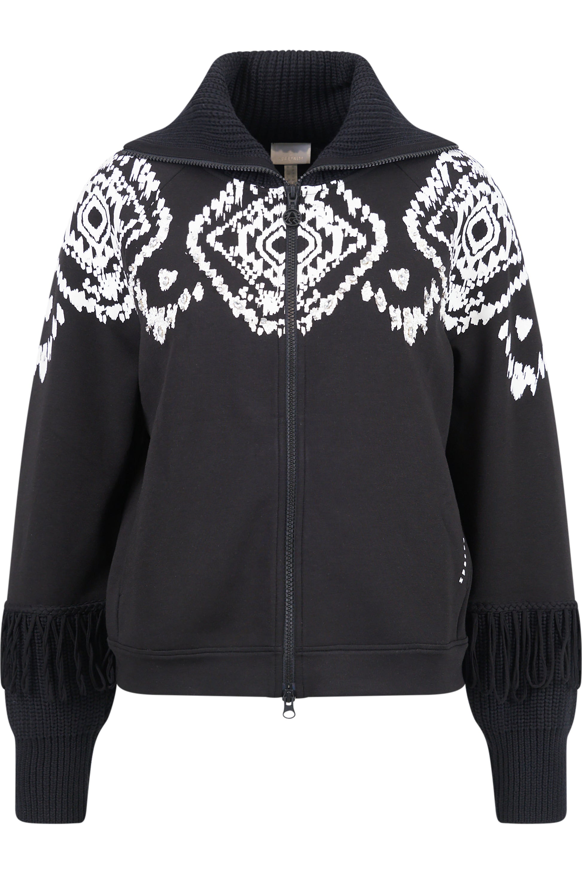 This fancy sweat jacket is a real must-have piece. With its traditional Norwegian print, decorated with sparkling stones, sequins and fringing on the sleeves, it combines charm and extravagance in one design.