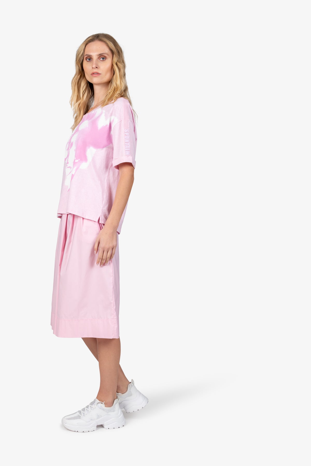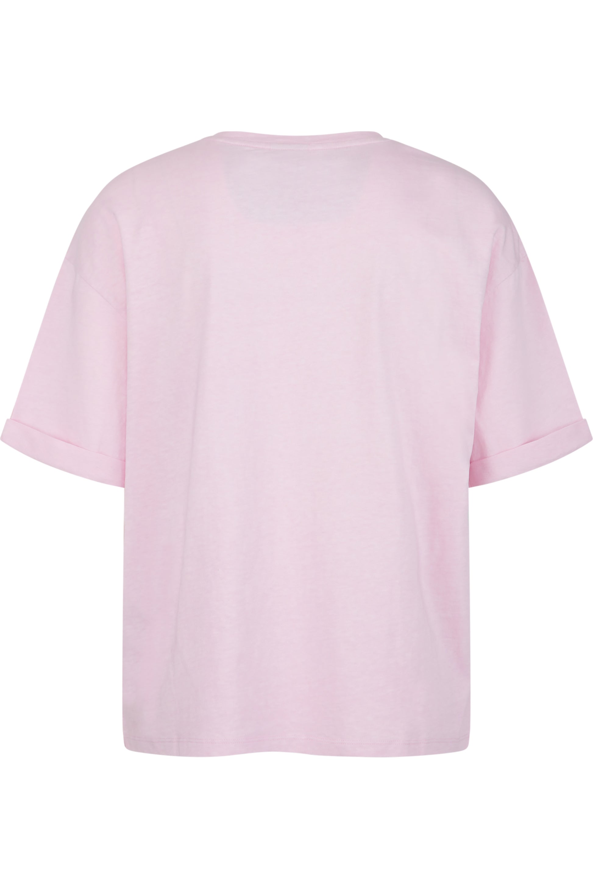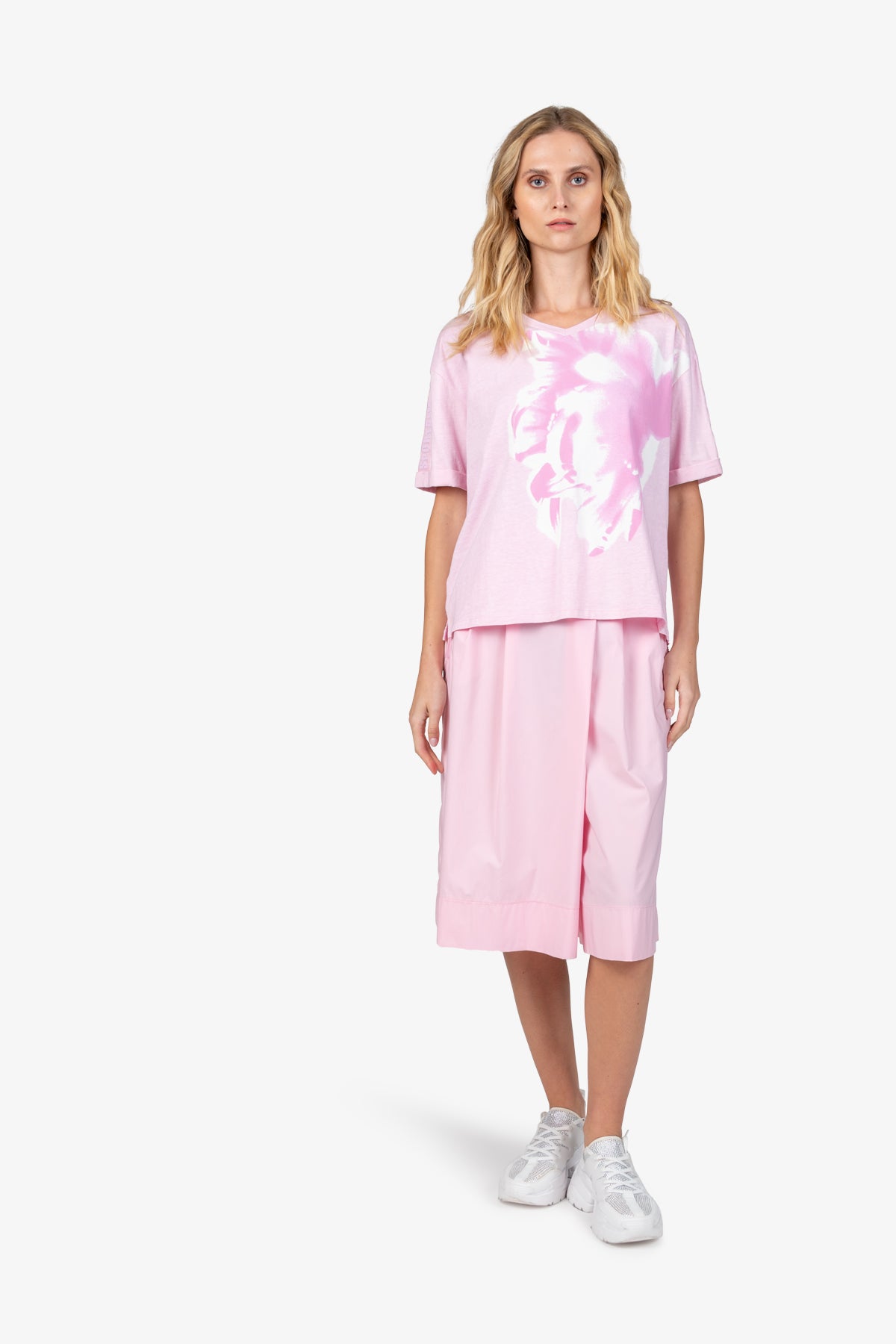 The short-sleeved shirt with a large, floral print on the front, made from vegan jersey fabric, is a sustainable and stylish choice. It offers comfort and a fresh, vibrant look for the summer.