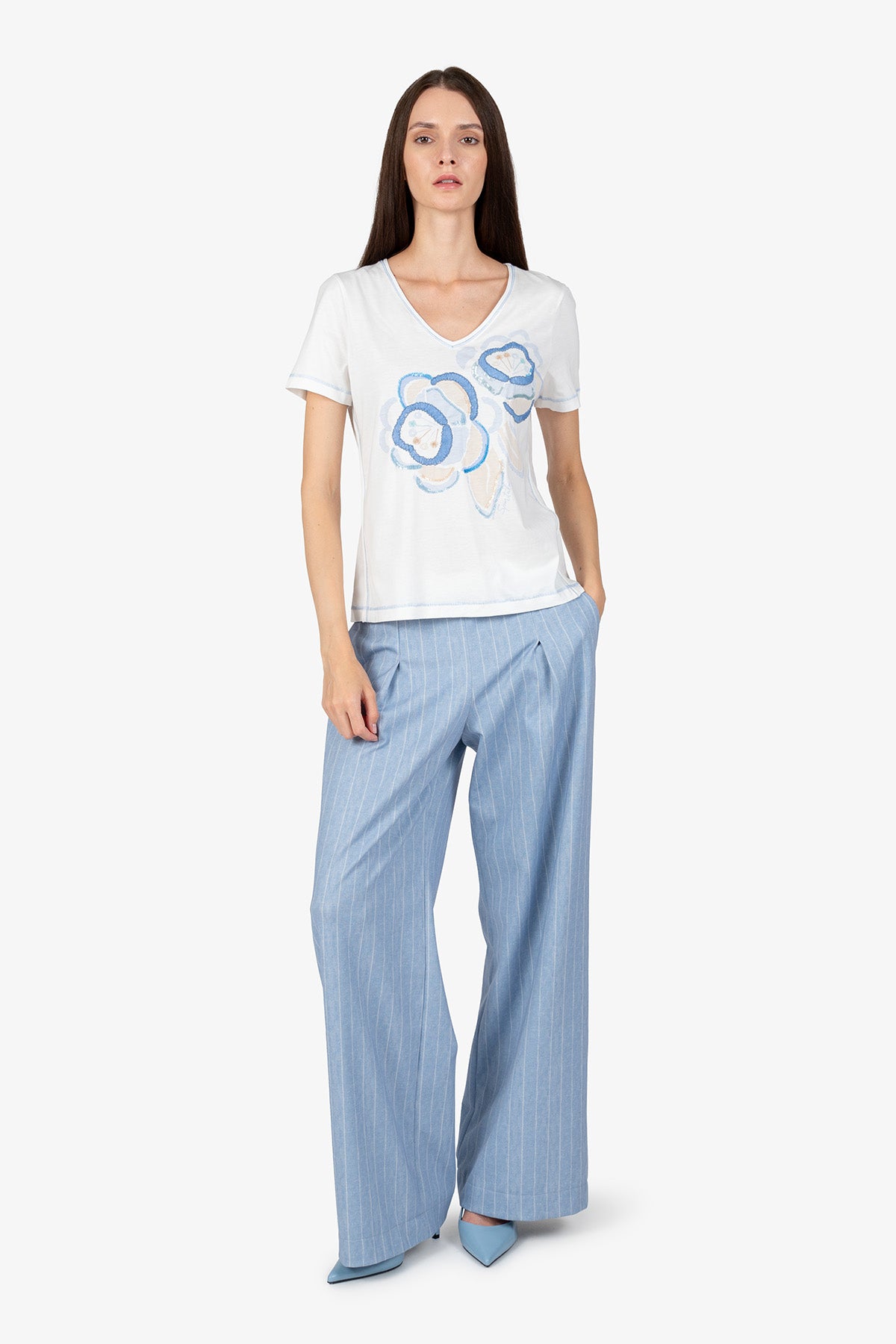 This classic shirt, which suits every woman, impresses with a floral print on the front, decorated with additional embroidery and sequins. It adds a feminine and elegant touch to any outfit.