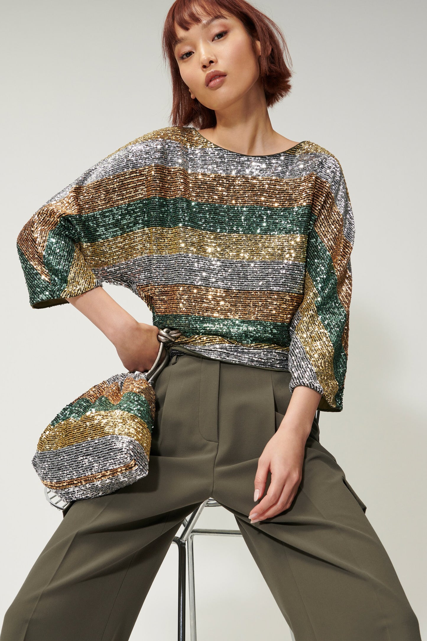 短襯衫,採用彩色條紋設計,飾有閃亮亮片飾邊。