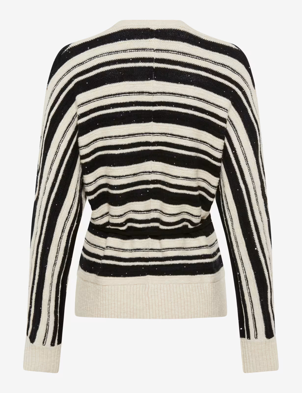 醒目的黑白圖案優雅地貫穿整件開襟衫,賦予其動態輕盈的質感。精緻優雅:柔美的裹身造型搭配繫帶腰帶,優雅地凸顯腰線,並提供可調節的修身剪裁。前開襟設計賦予整件單品休閒的氣息。