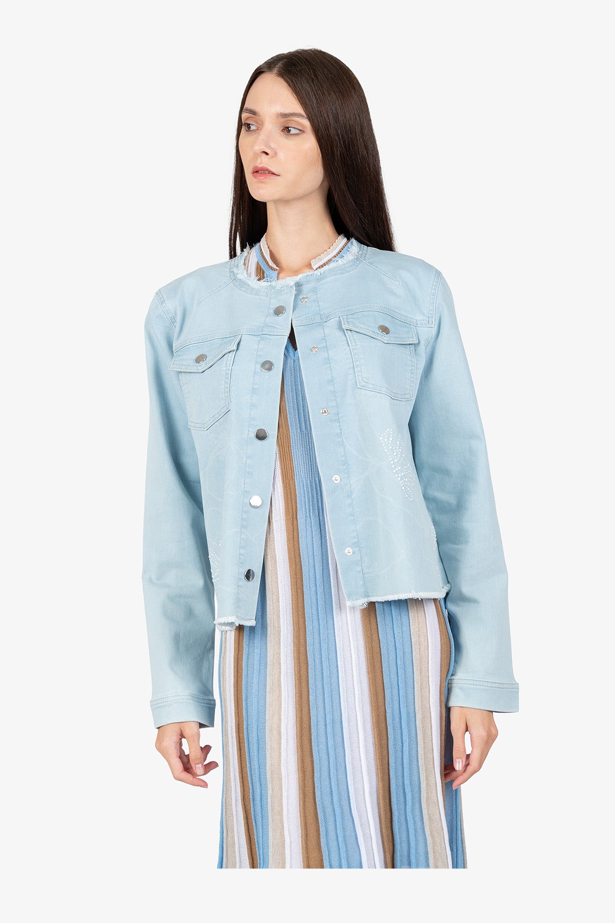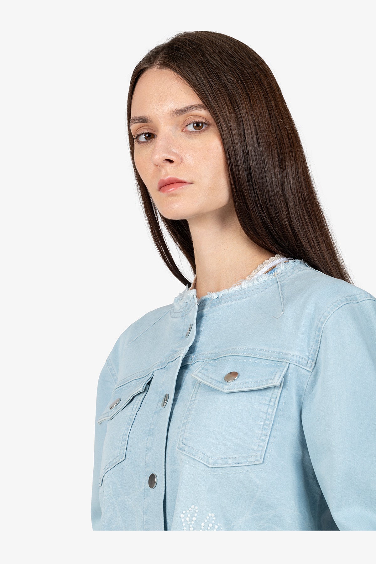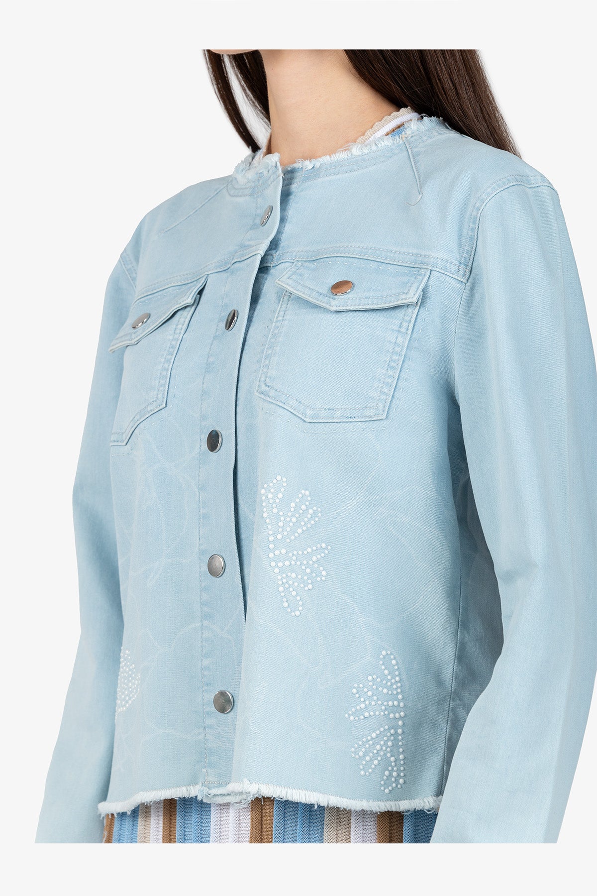 這款引人注目的牛仔夾克結合了獨特的雷射印花和優雅的珍珠刺繡。充滿女性氣息和時尚感,可為任何服裝增添獨特而時尚的氣息。