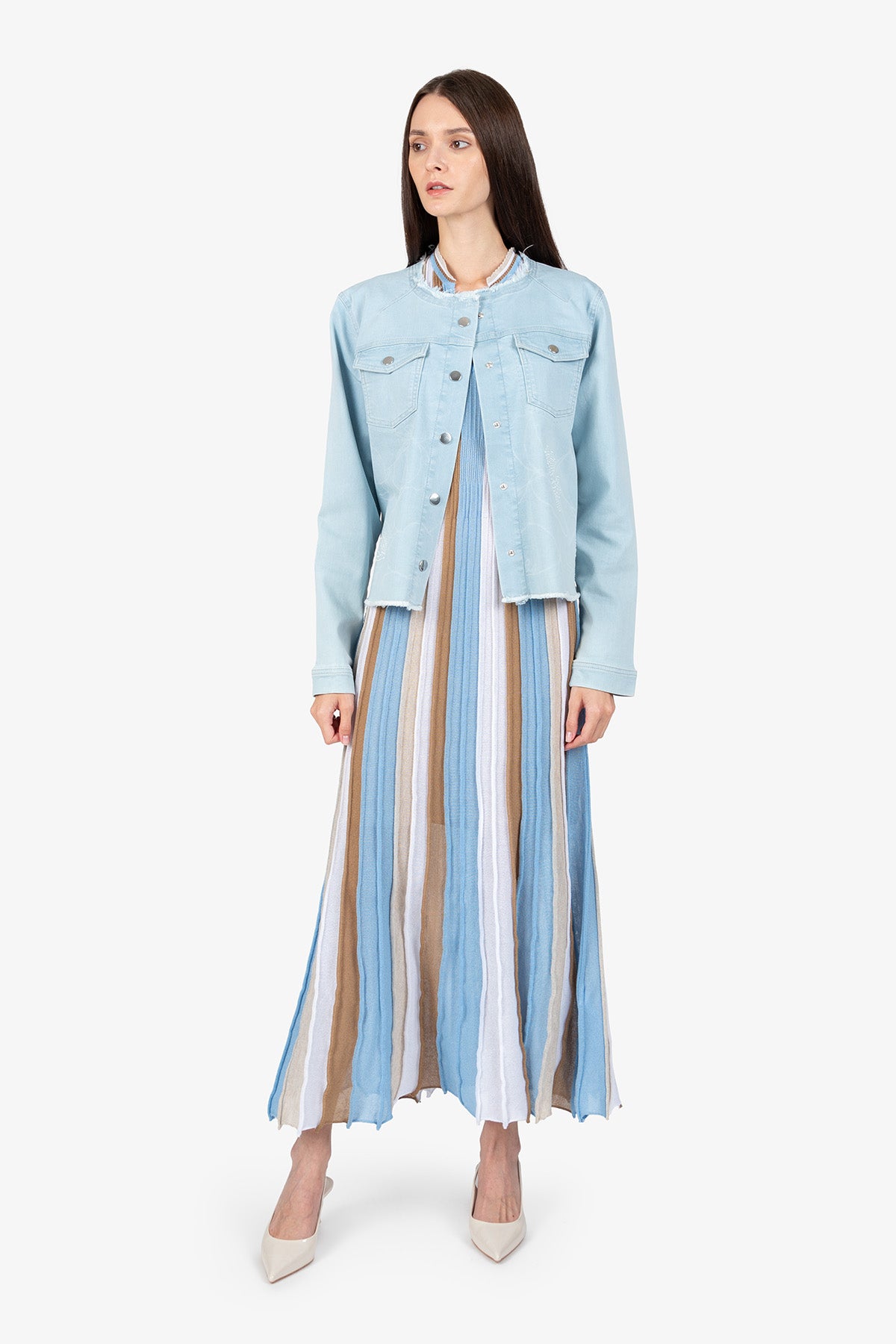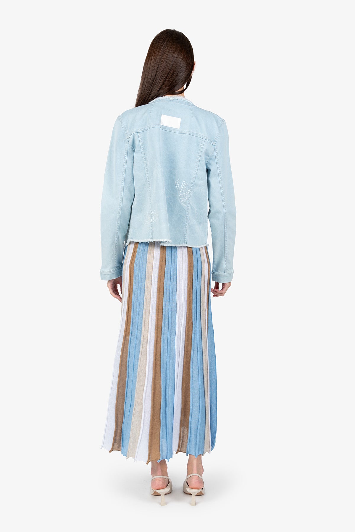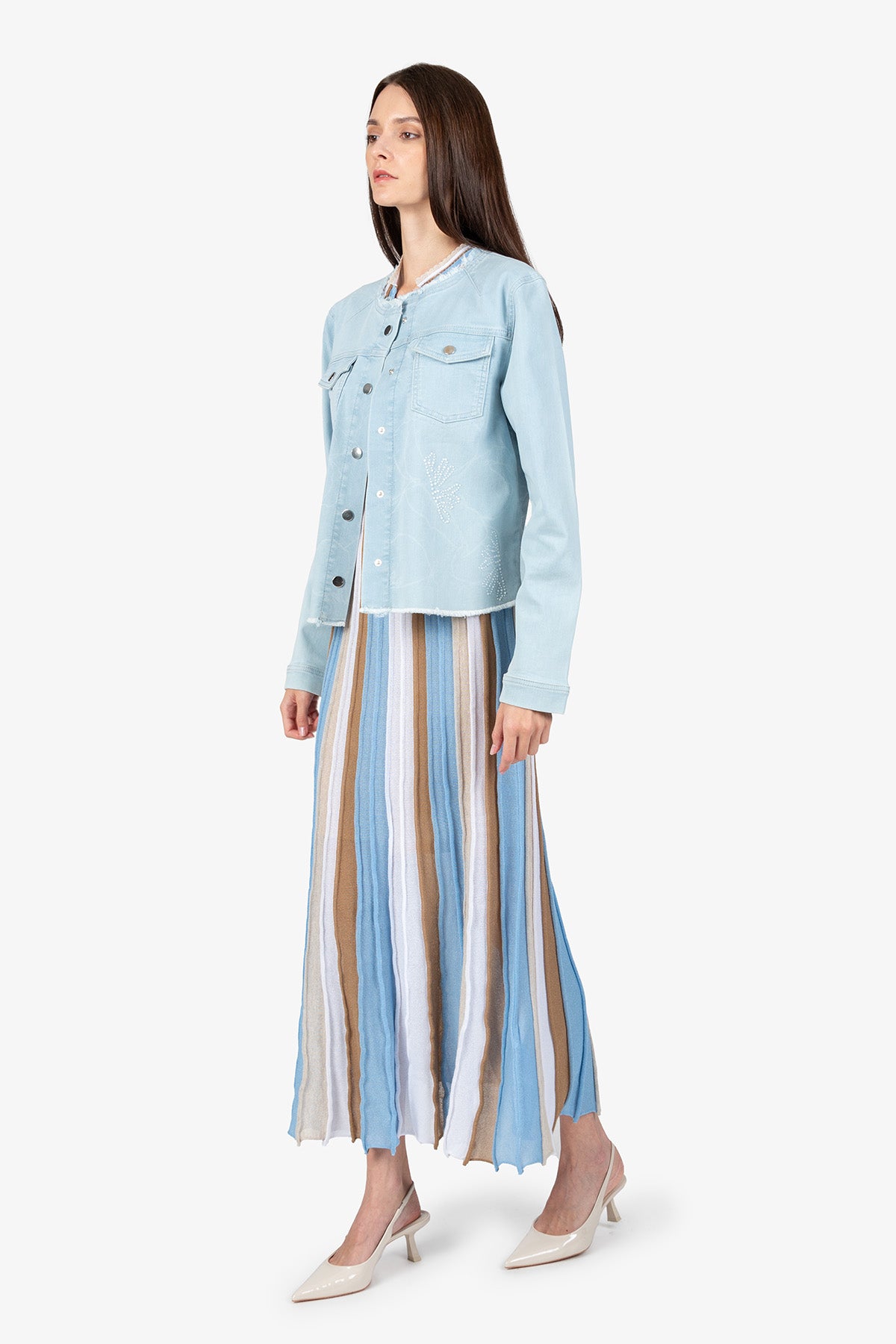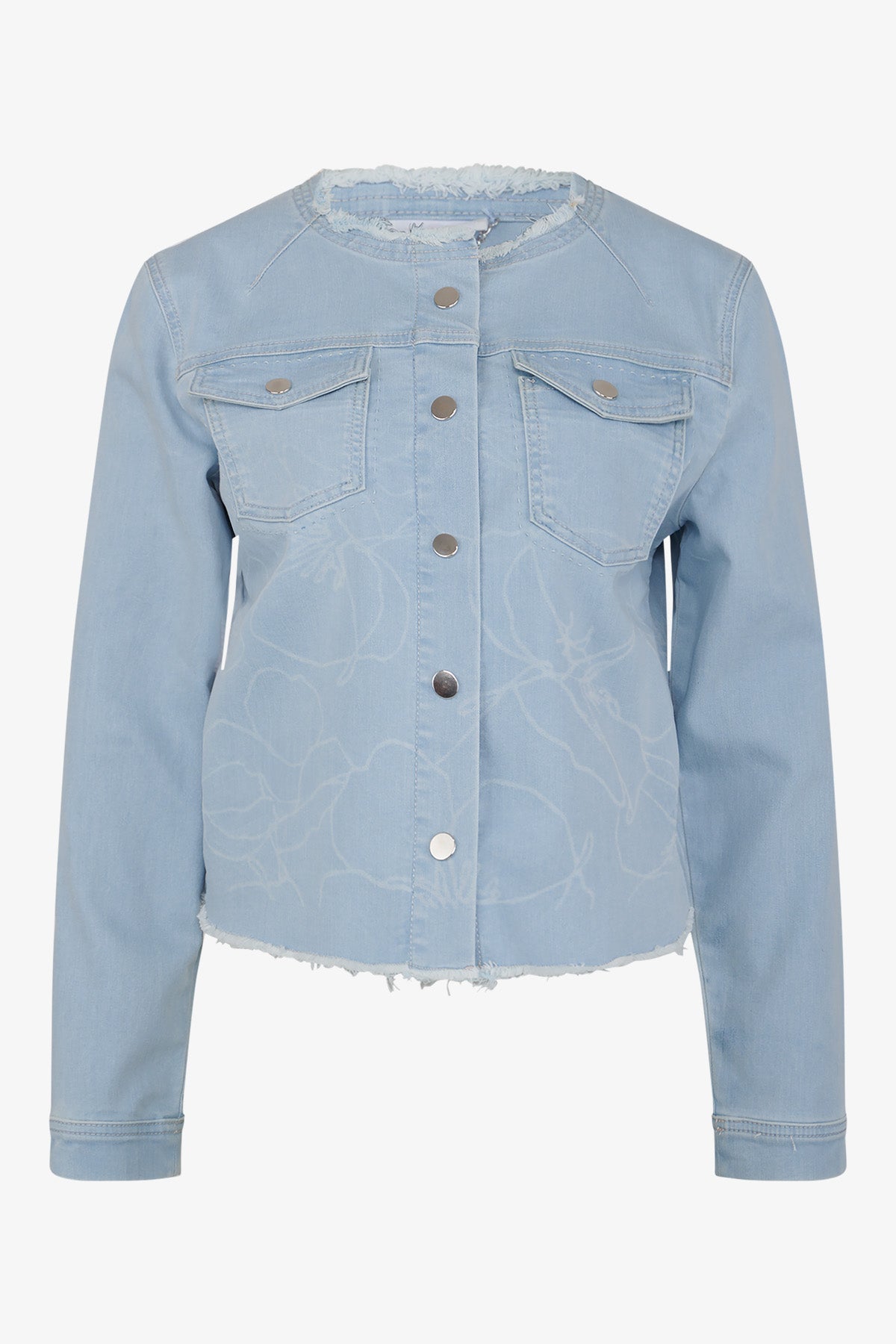 這款引人注目的牛仔夾克結合了獨特的雷射印花和優雅的珍珠刺繡。充滿女性氣息和時尚感,可為任何服裝增添獨特而時尚的氣息。