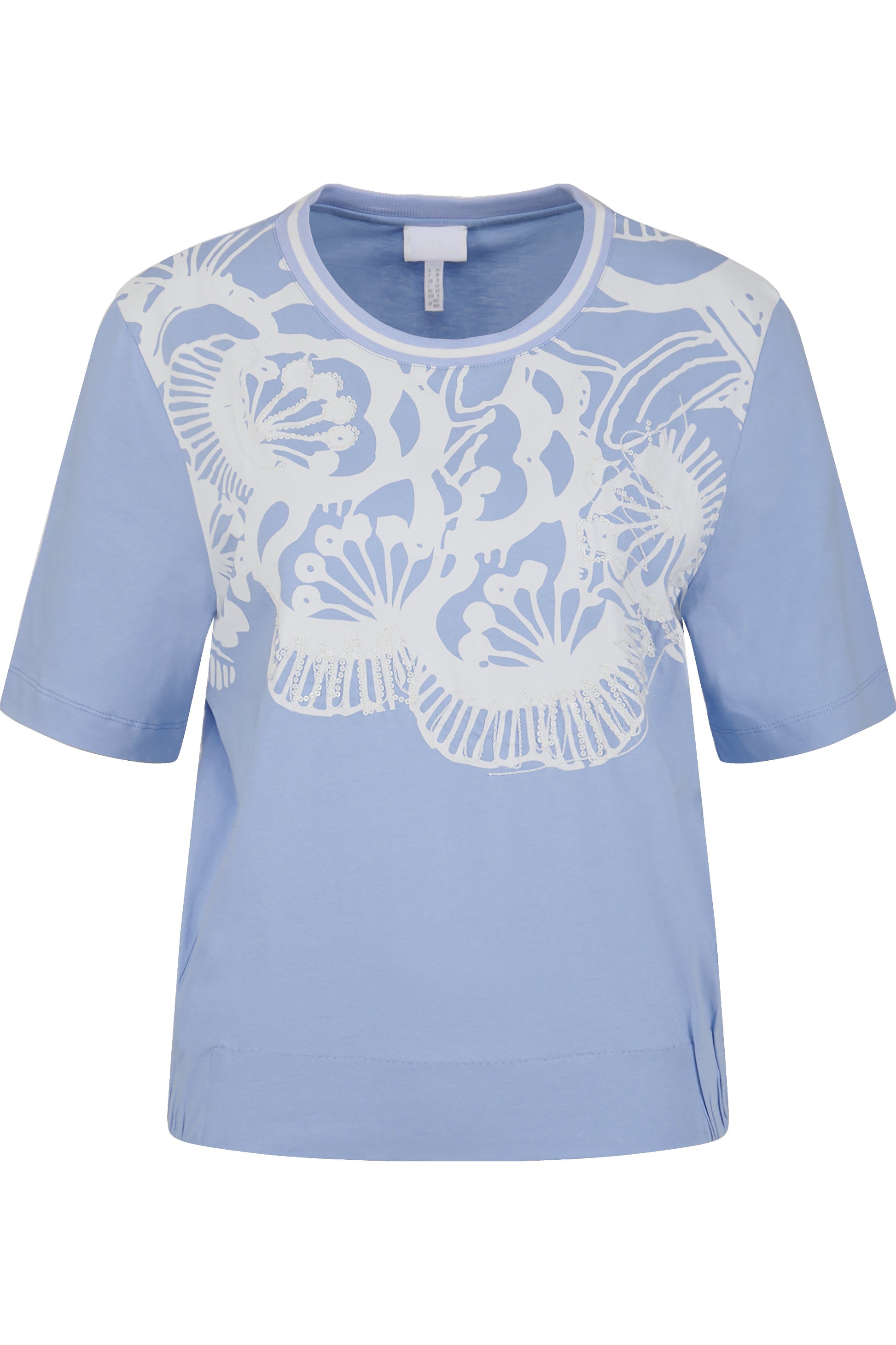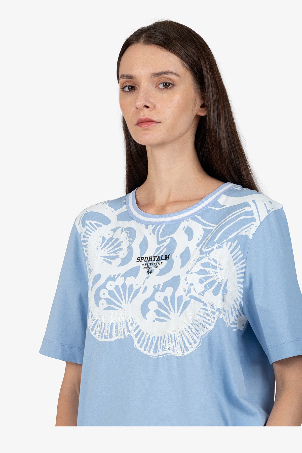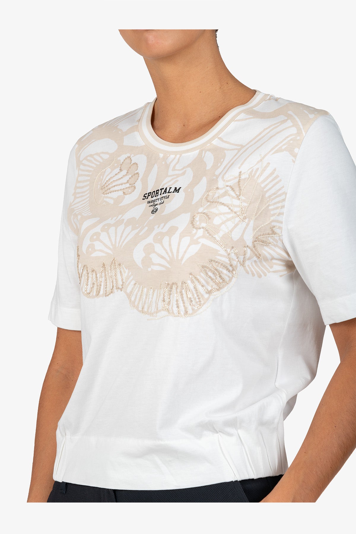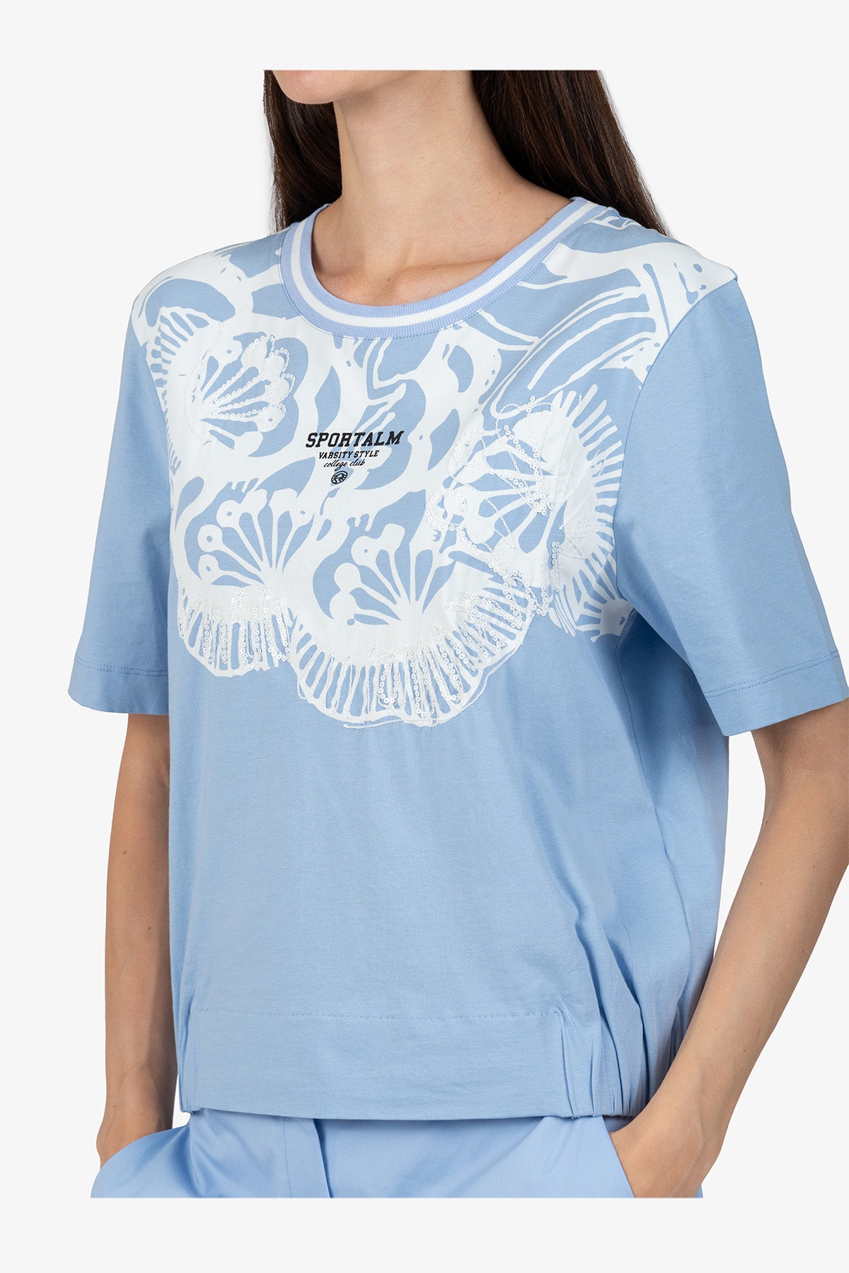 亮片刺繡裝飾花朵圖案圓領T恤