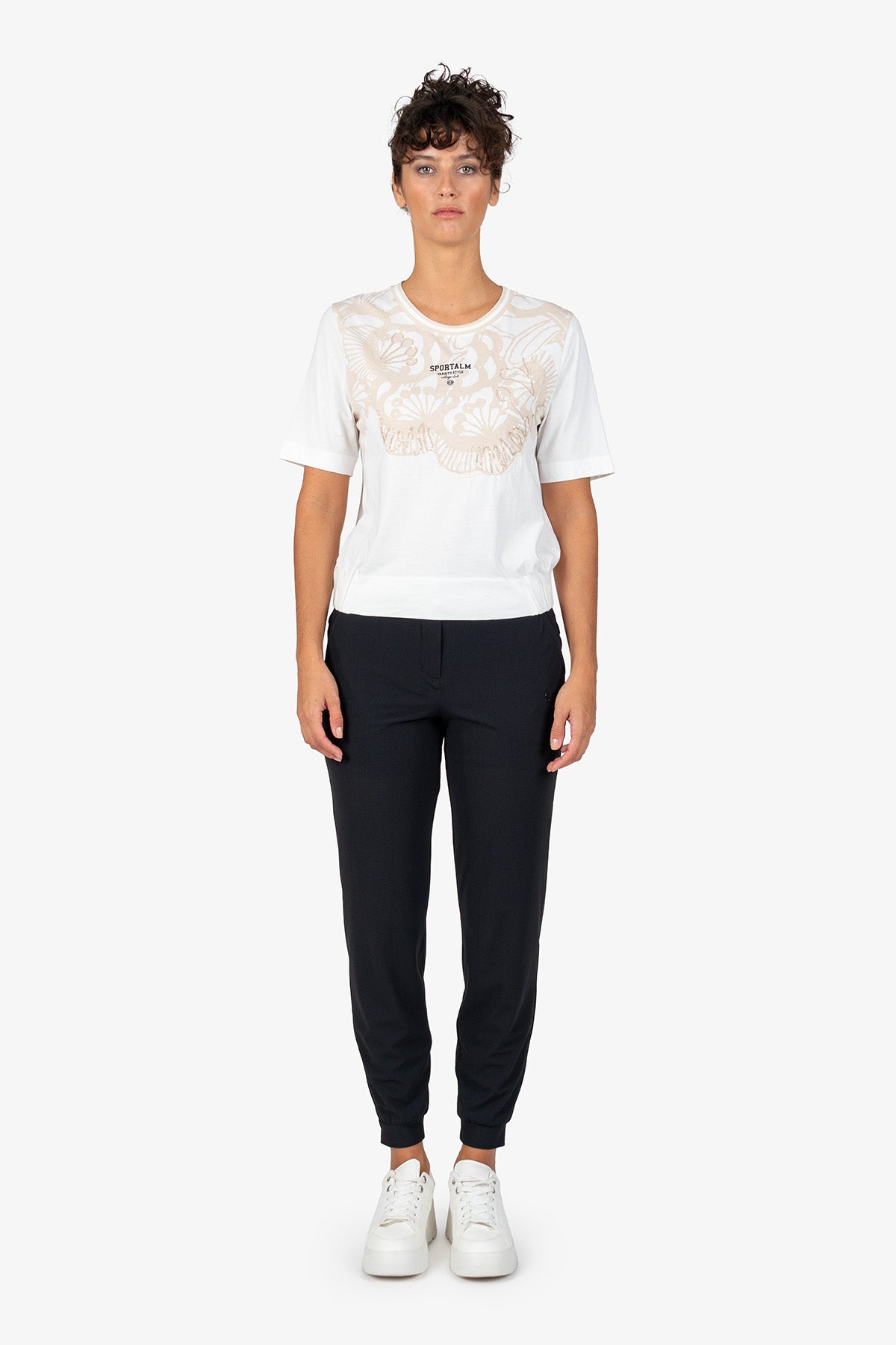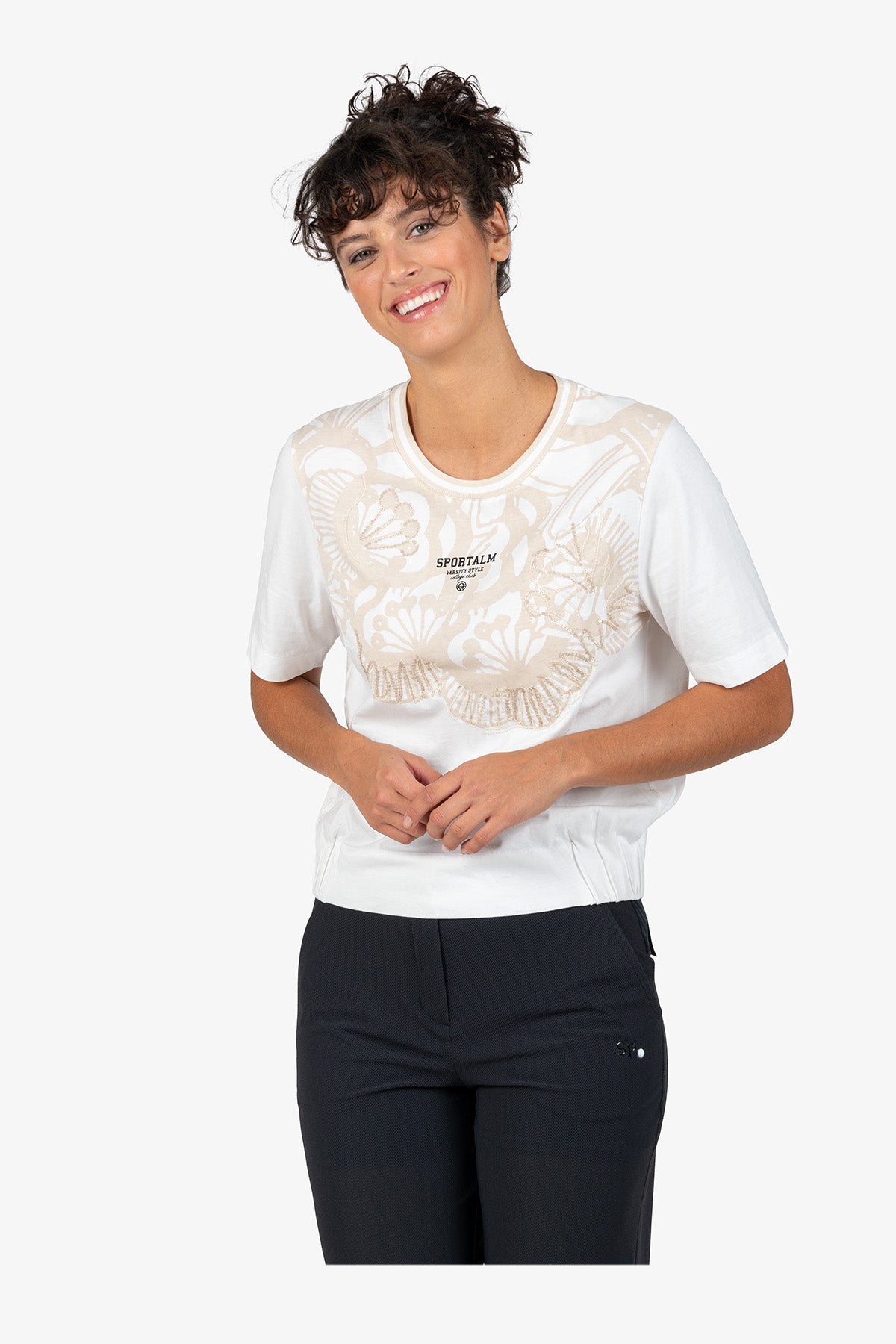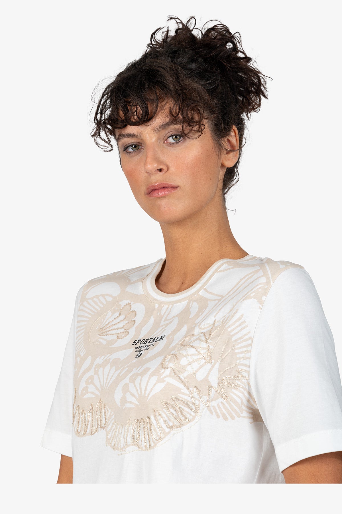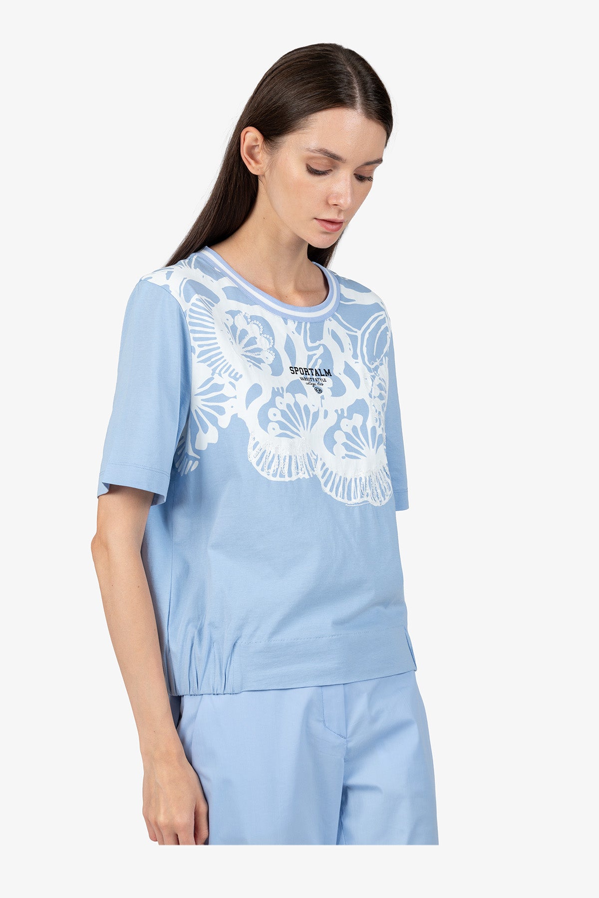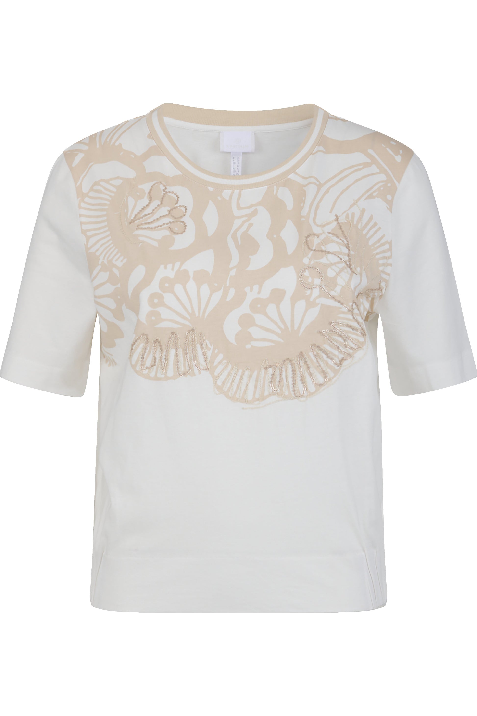 亮片刺繡裝飾花朵圖案圓領T恤