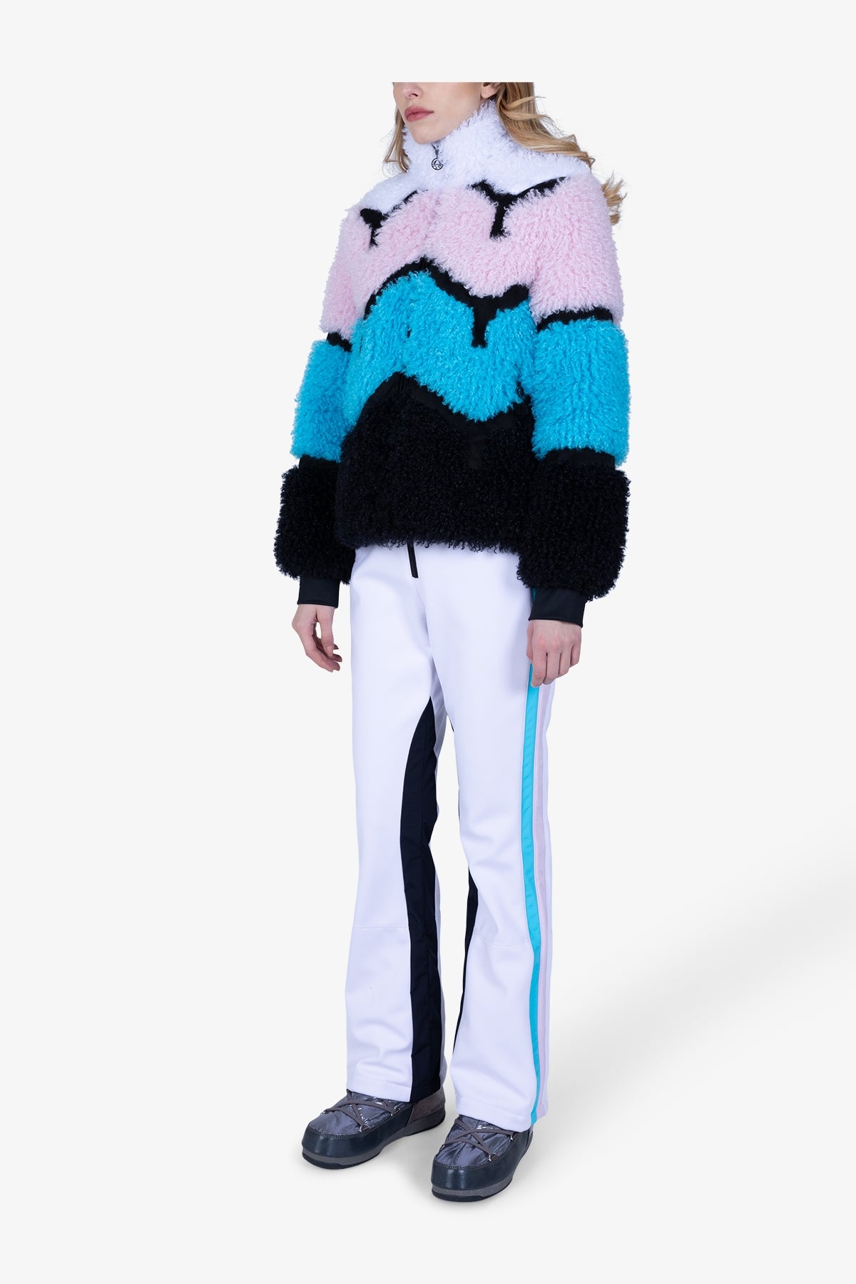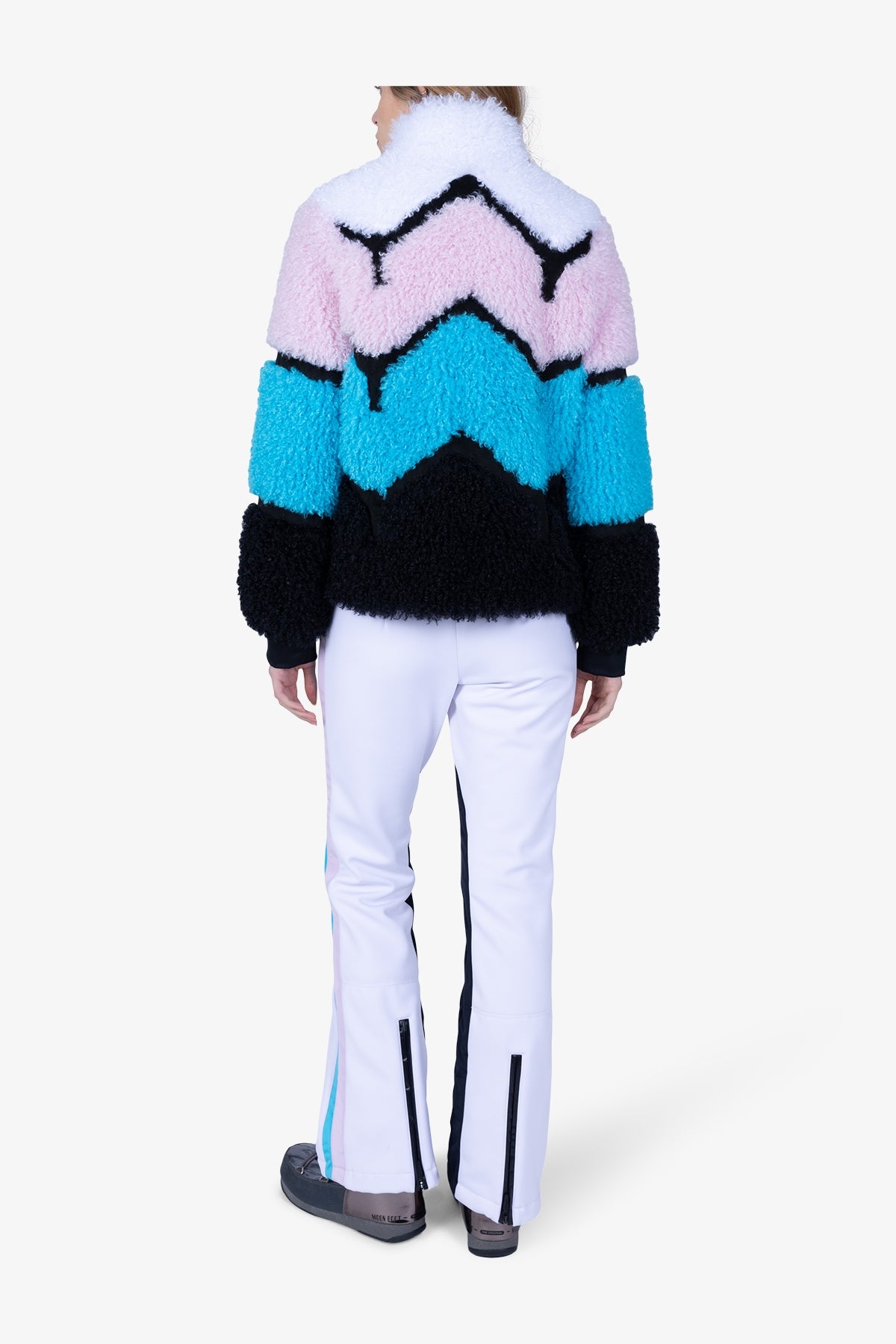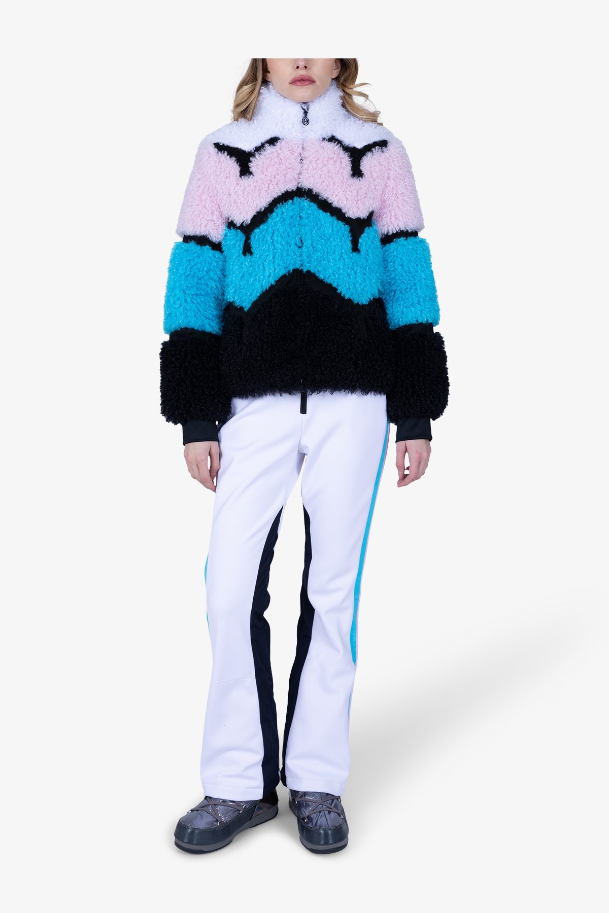 這款採用柔軟人造毛皮製成的超現代滑雪服,以其醒目的圖案和高立領設計令人印象深刻。它將獨特的風格與舒適的保暖性完美結合,是滑雪場上的耀眼明星。