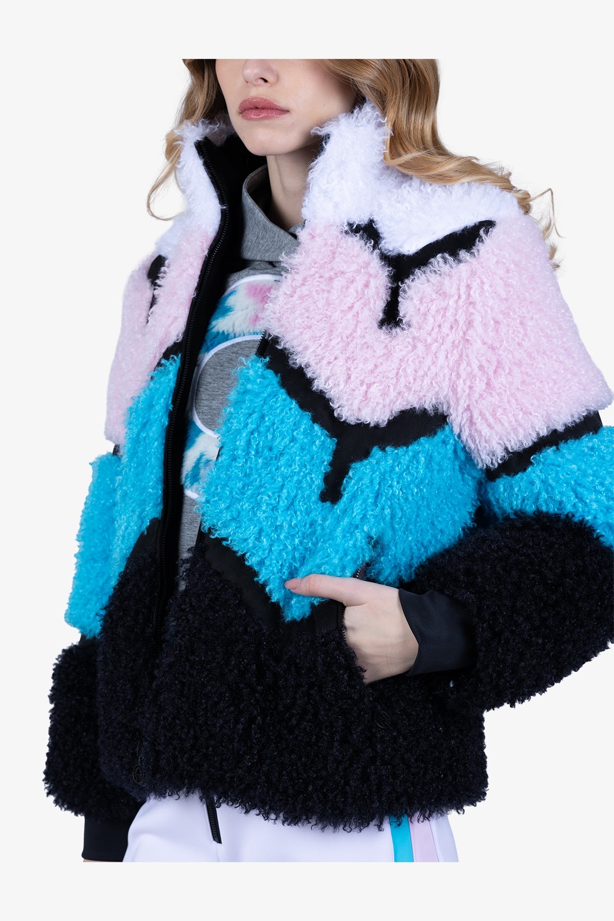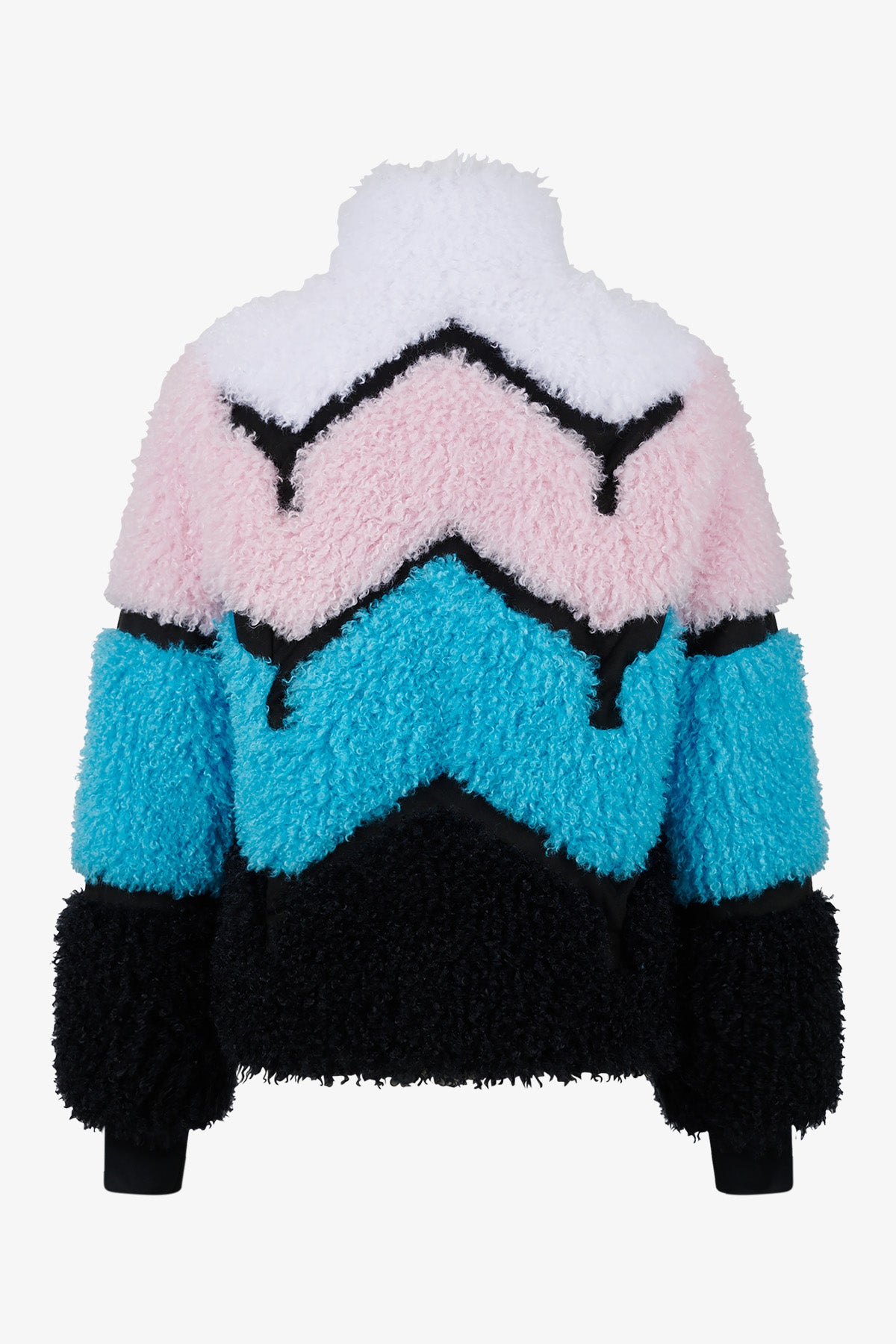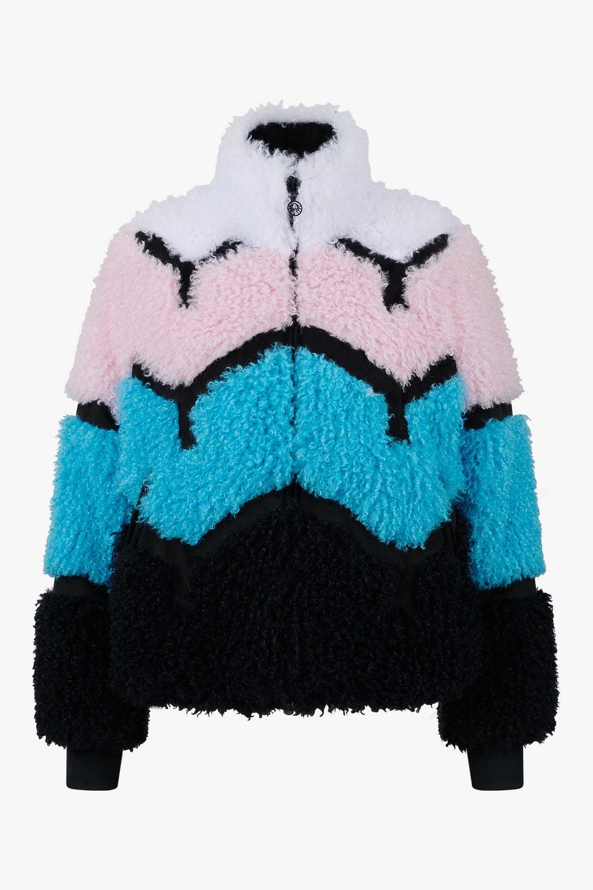 這款採用柔軟人造毛皮製成的超現代滑雪服,以其醒目的圖案和高立領設計令人印象深刻。它將獨特的風格與舒適的保暖性完美結合,是滑雪場上的耀眼明星。
