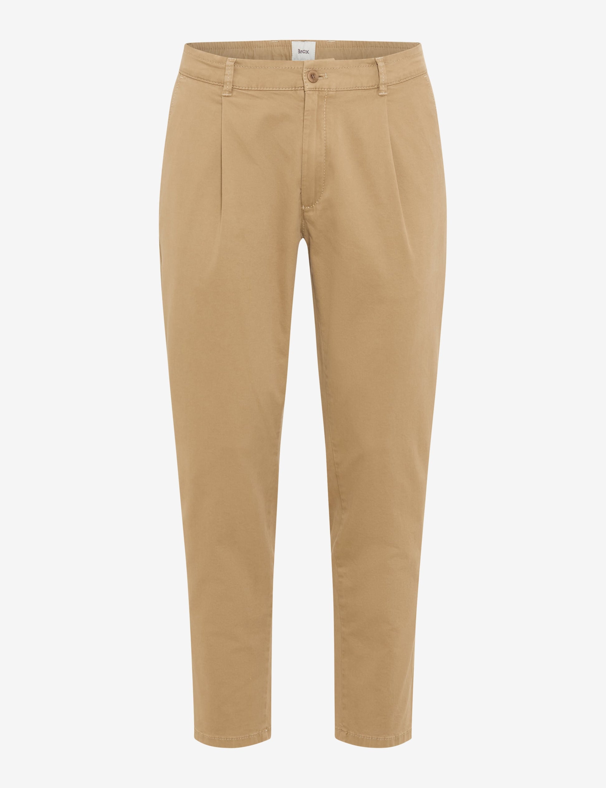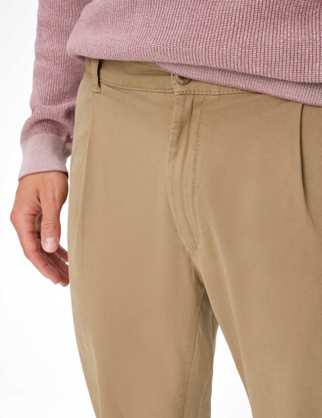 修身輪廓、錐形剪裁和標準腰線帶來現代感,更因內縫縮短而顯得格外時尚。時尚褶皺和精緻的裝飾鉚釘等現代細節賦予這款褲子獨特的個性。另一方面,經典的貼邊後口袋和法式口袋等經典元素也格外引人注目。