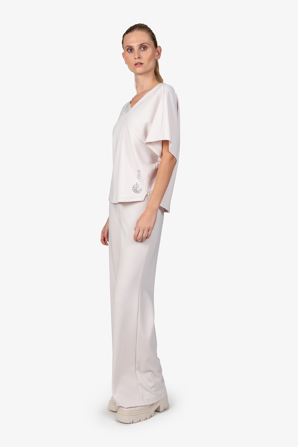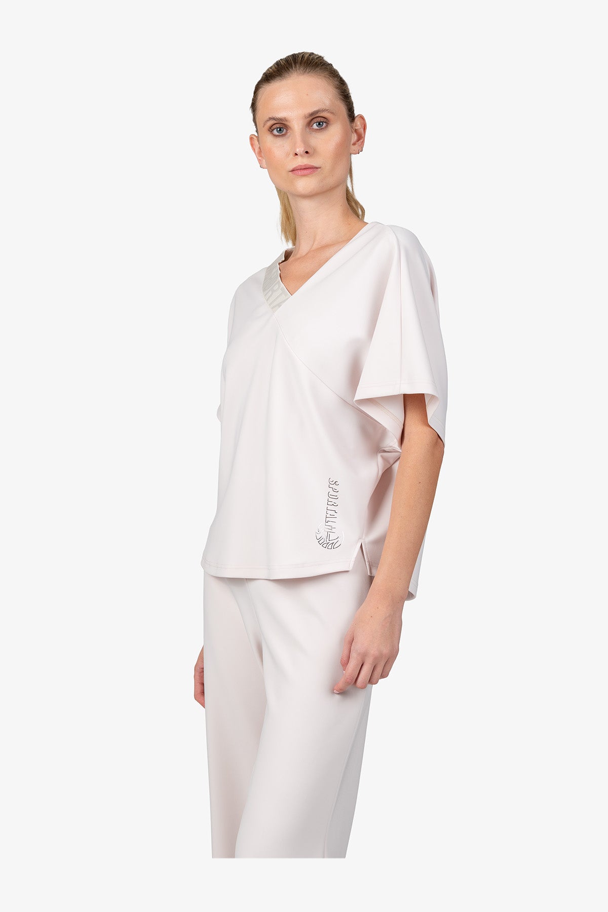不對稱襯衫,V 領,蝙蝠袖。這款獨特的設計適合各種身材,並彰顯時尚。一款多功能且時尚的服裝。