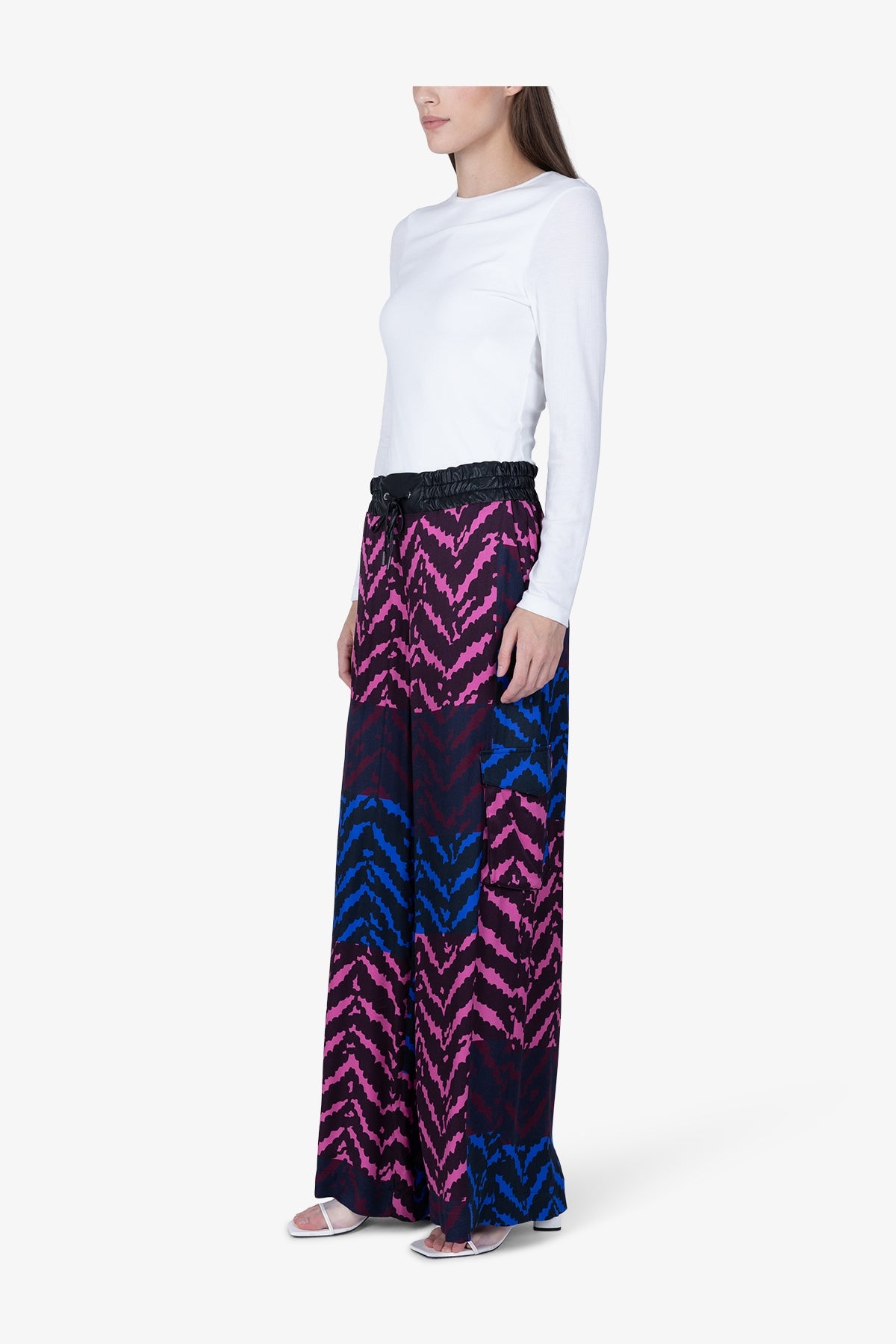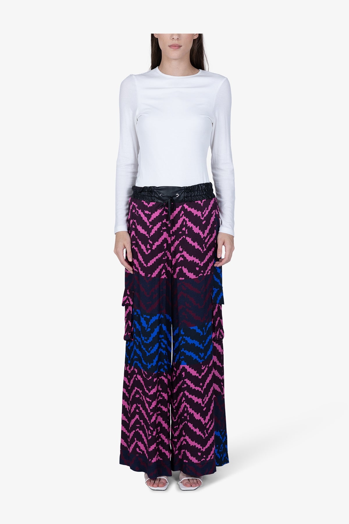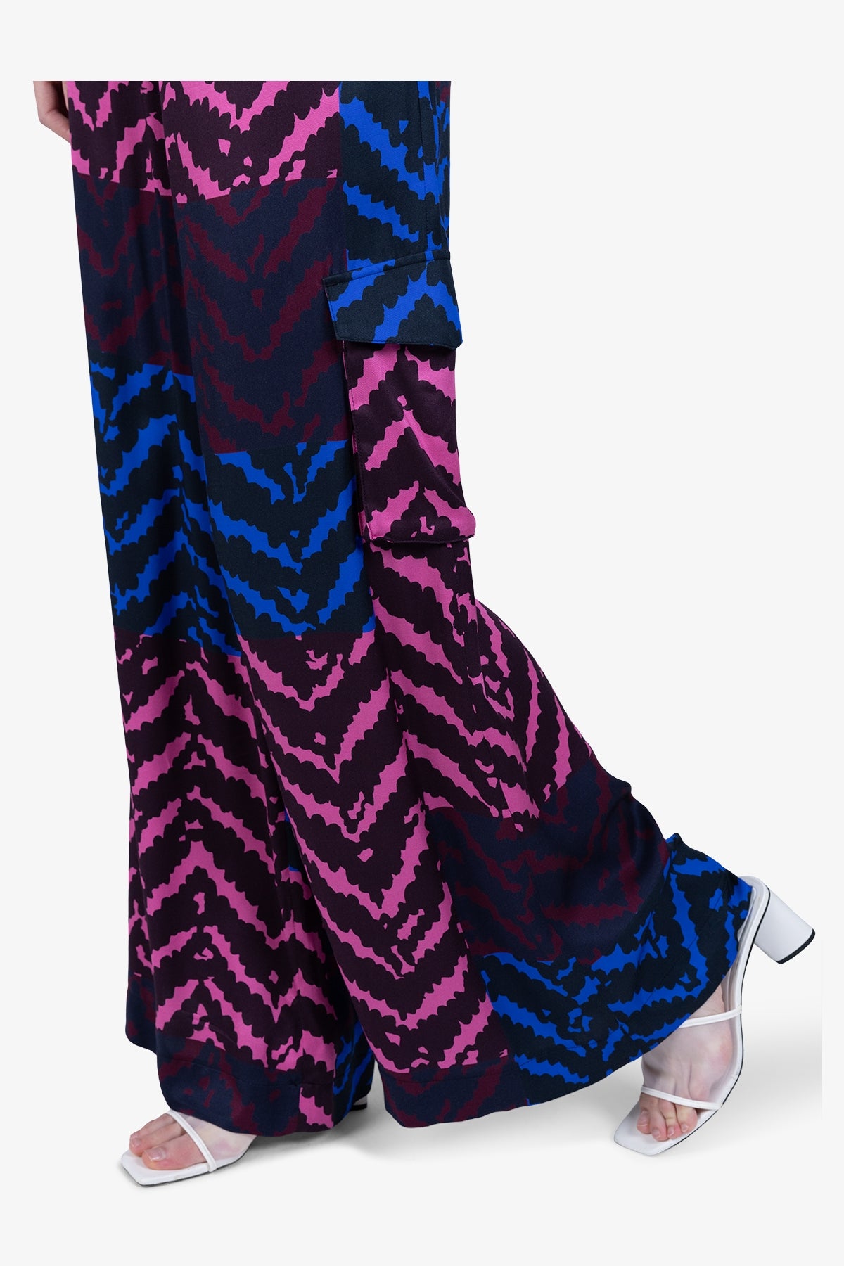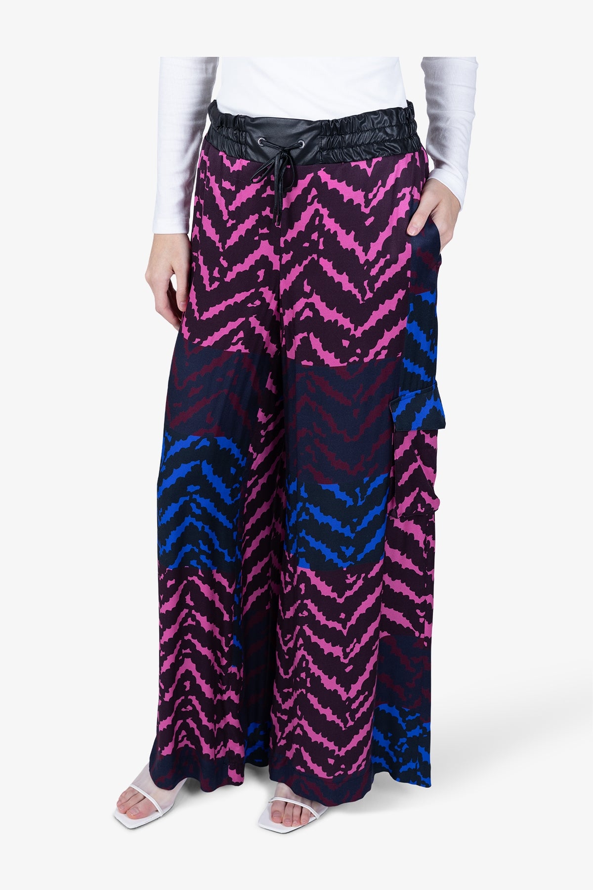 這款闊腿褲以精美的鋸齒狀印花驚艷亮相,令人眼前一亮。仿皮革腰帶和側邊風琴袋賦予其現代時尚的風格。
